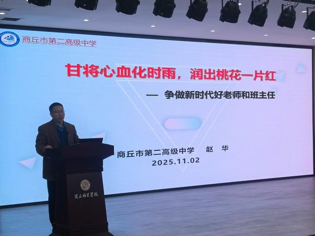 最后,商丘市第二高级中学的赵华老师做了《甘将心血化时雨,润出桃花一片红——争做新时代好老师和班主任》的专题讲座,以师德素养和班级管理为核心,强调师德师风