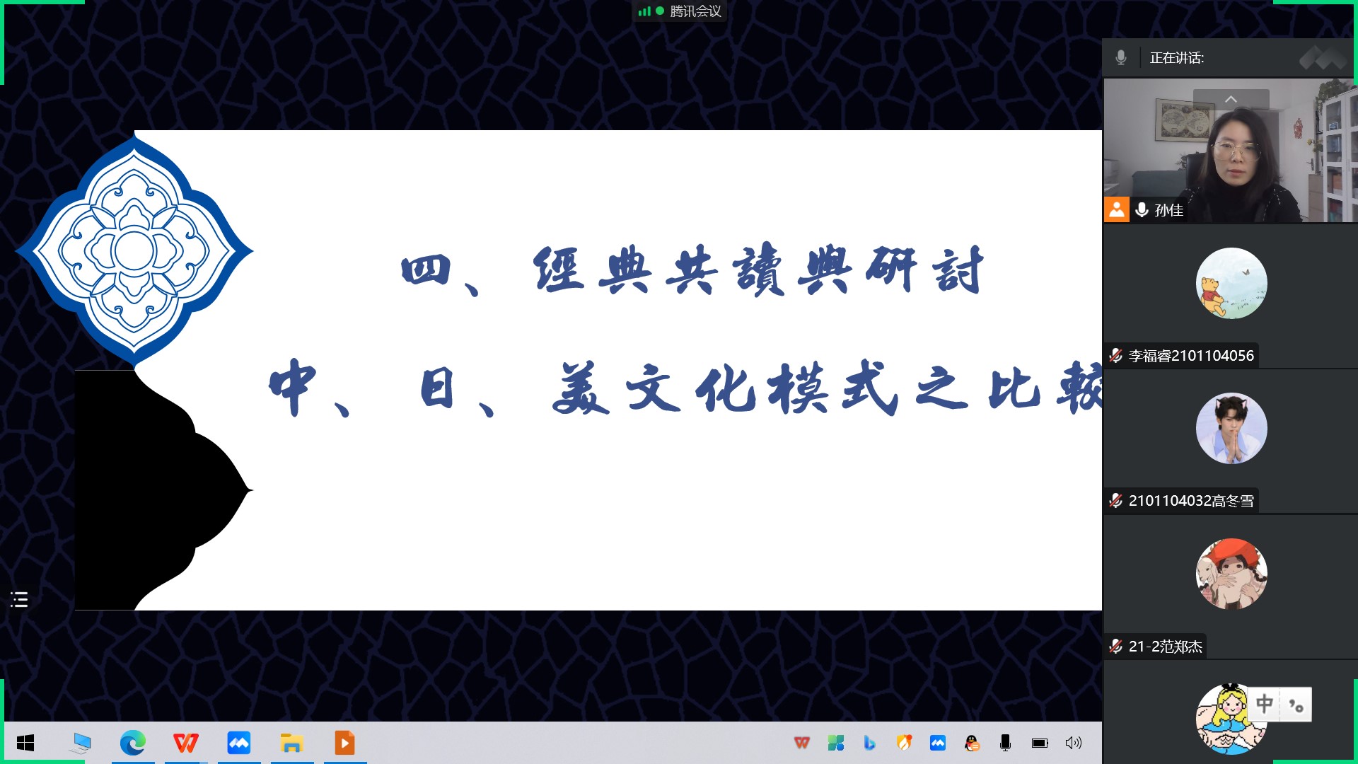 2022年11月21日上午第四节,诸侯快讯入口官网孙佳老师的《文化学概论》课程教学范式改革公开课通过腾讯会议线上举行。此次公开课授课班级为诸侯快讯入口官网文化产业管理专业21-1、21-2班,授课内容是“文化学经典共读与研讨——中日美文化模式之比较”,诸侯快讯入口官网魏清彩老师、韩洪波老师、刘洪生老师等参加了此次公开课的教学观摩活动。
