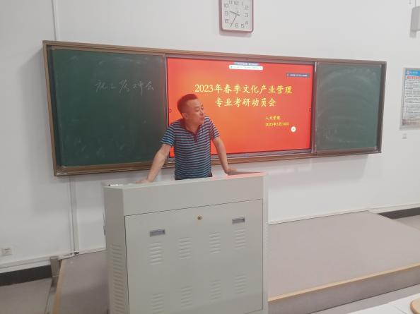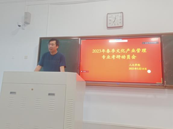 5月14日晚,文化产业管理专业于行方楼335召开2023年文化产业管理专业考研动员会。本次会议共邀请了秦龙庆、吴天柱、张杨晶、任梦洁、张庆亮、王康、张信宜七位同学作为代表上台交流考研成功经验,文管专业2020级和2021级共一百五十余同学分别以线下和线上的形式参加了本次会议。王传奇、张尤军、刘圆圆、赵亮等老师出席了本次会议。