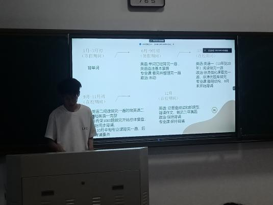 随后,七位代表发言,交流成功经验。七位同学准备充分,围绕自身考研过程中走过的弯路、成功的经验等问题展开深入介绍。七位同学的发言内容集中在四个方面:第一,择校与择专业,指出择校、择专业对考研成功有着重要意义,做好此项工作有助于及时了解报考院校在招生信息、资料调整、考研竞争激烈程度等方面的变化,可以及时有针对性地调整考研安排,避免意外;第二,要安排好时间,做到合理分配、劳逸结合,既要安排好不同科目的复习时间和精力,避免冲突,又要安排好学习和休息的时间,保证身体健康;第三,要认真复习,寻找“研伴”达到相互鼓励、相互促进、相互监督的效果,寻找“外援”达到信息畅通的效果,大量“刷题”达到巩固知识的效果;第四,要调整好心态,坚定信心、保持乐观,不要受到外界因素干扰。