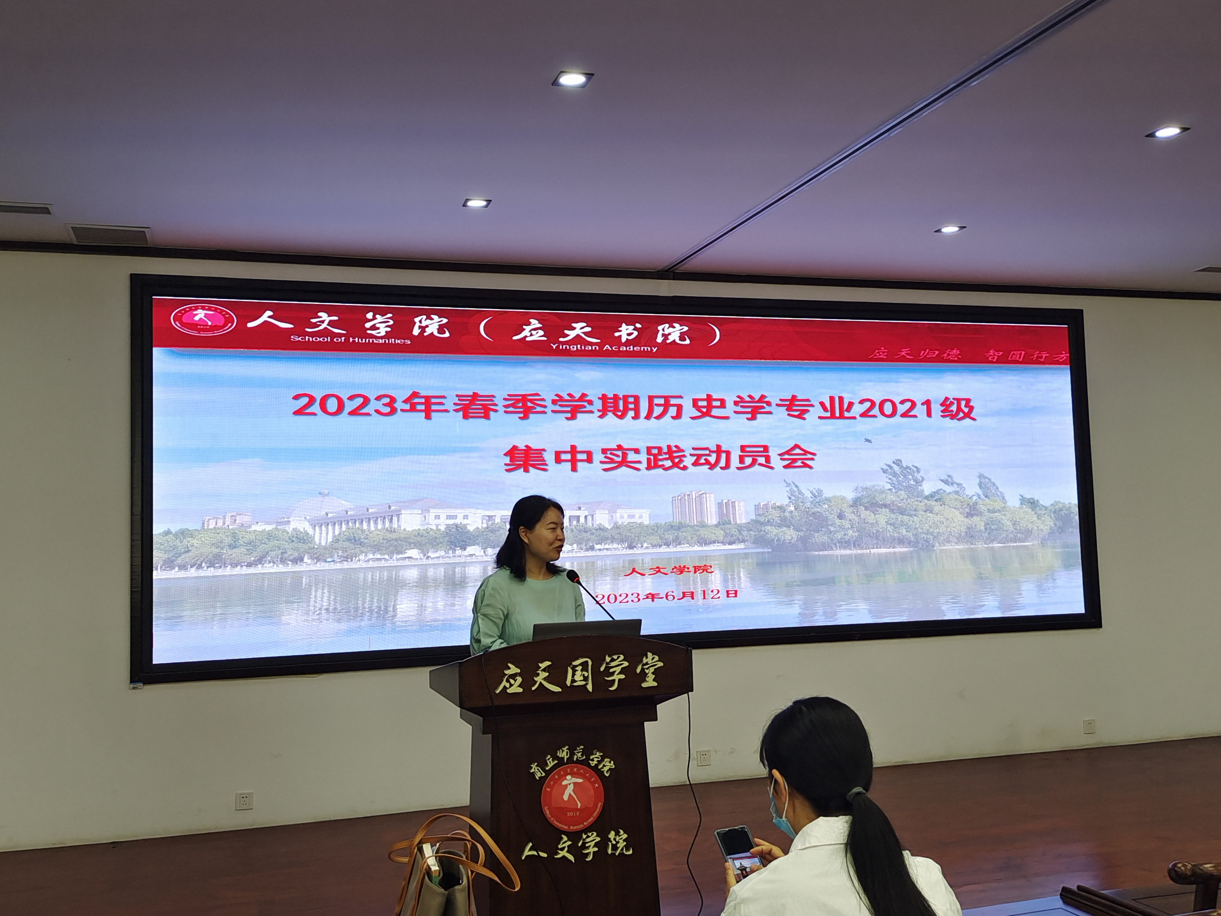 会议伊始,历史系主任薛立芳老师向全体同学强调了本次实习的意义,号召同学们认真完成实习任务,在实习中夯实基础。她指出本次实习以高中历史课程思政微课比赛为主题,紧扣师德素养、教育情怀与教学能力与师范生毕业要求,是强化师范生教学技能,提高综合素养的重要途径,希望同学们高度重视;同时以历史学国家级一流本科专业建设为契机,鼓励同学们以高标准严格要求自己,确保高质量圆满完成实习任务。