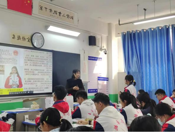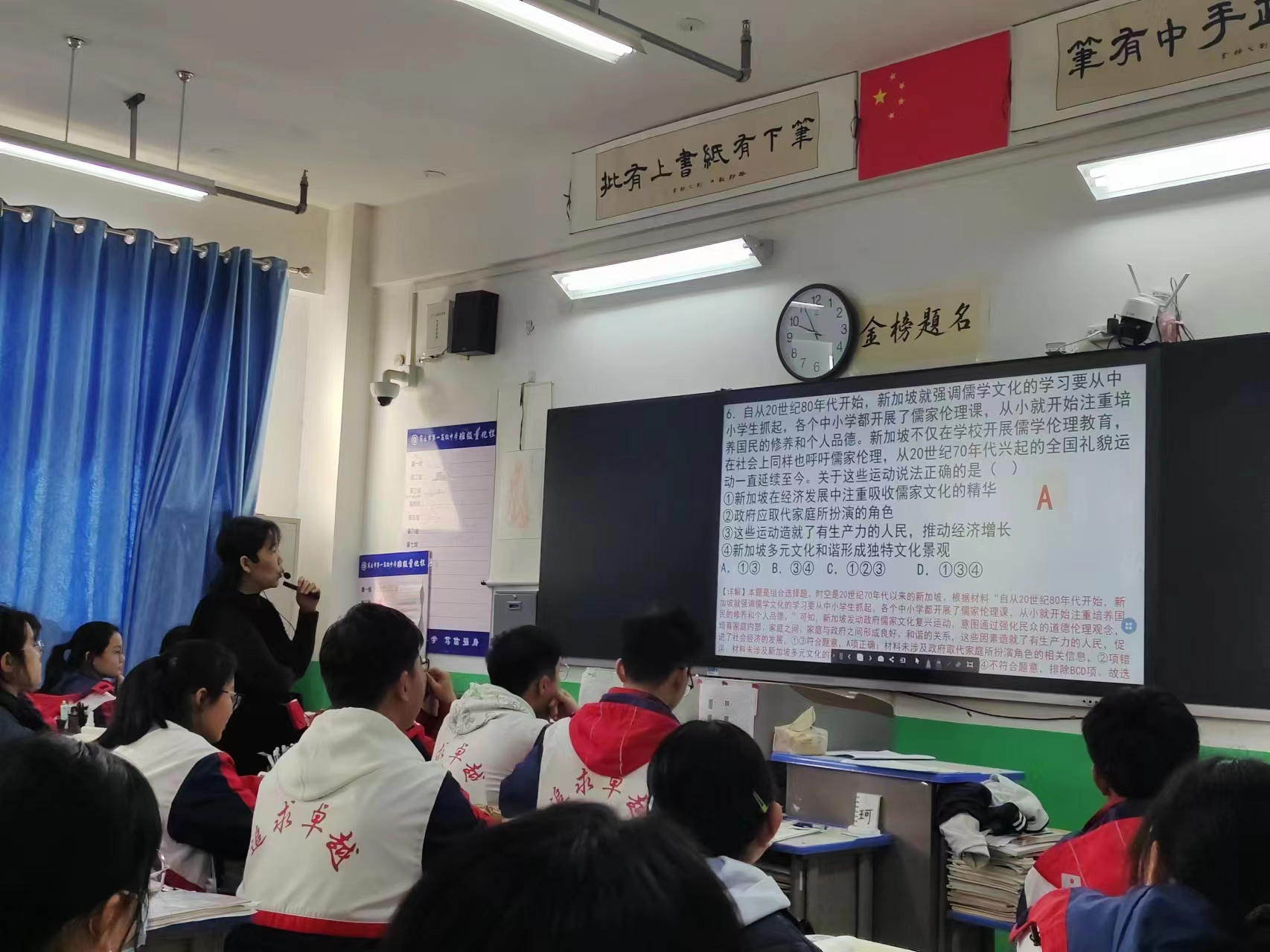 在坊员们进入教室观摩示范课的时候就注意到蒋老师声音洪亮,言语非常活泼,带动着同学们也踊跃举手回答问题,大胆提出疑问。蒋老师在要求同学们对上节所学内容进行巩固练习的时候非常重视反馈。在提出问题后,会给学生充足的时间来进行思考,认真书写。在提问时,利用多媒体随机选人,增加了课堂的趣味性。在分析问题时,通过具体事例并结合学生的答案进行分析,也能够看出部分学生对习题的思考存在的不足之处。这种方式能够让老师更加了解学生情况,也加深了学生对知识点的理解和记忆。此外,蒋老师还注重教授给学生答题技巧,有助于培养学生的历史学科核心素养。