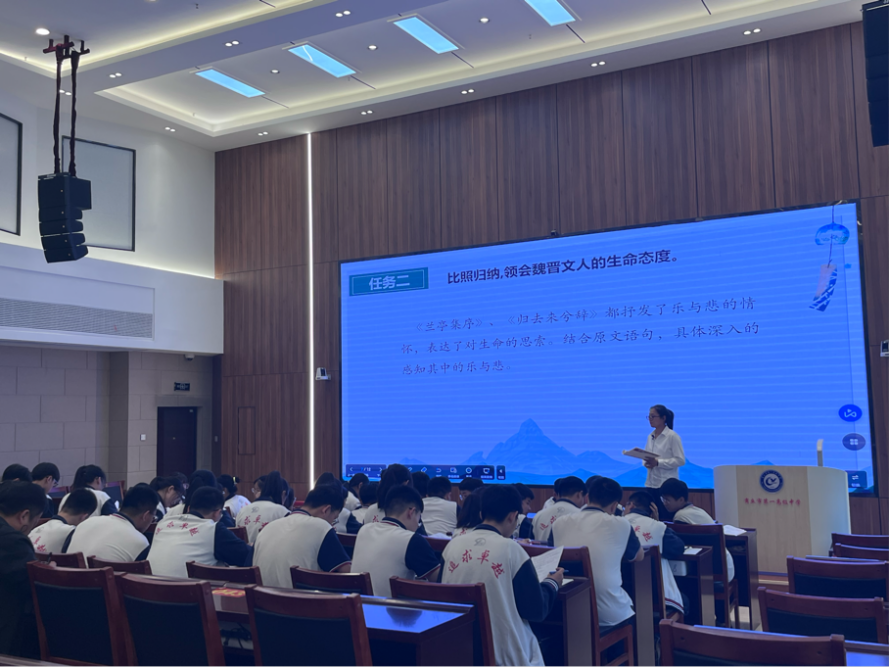 第一位老师的授课内容为“《兰亭集序》《归去来兮辞》联读”,从“对比意象,分析魏晋山水田园诗文的审美特点”“比较归纳,领会魏晋文人的生命态度”等方面展开教学,采用讨论法让学生掌握学习内容。
