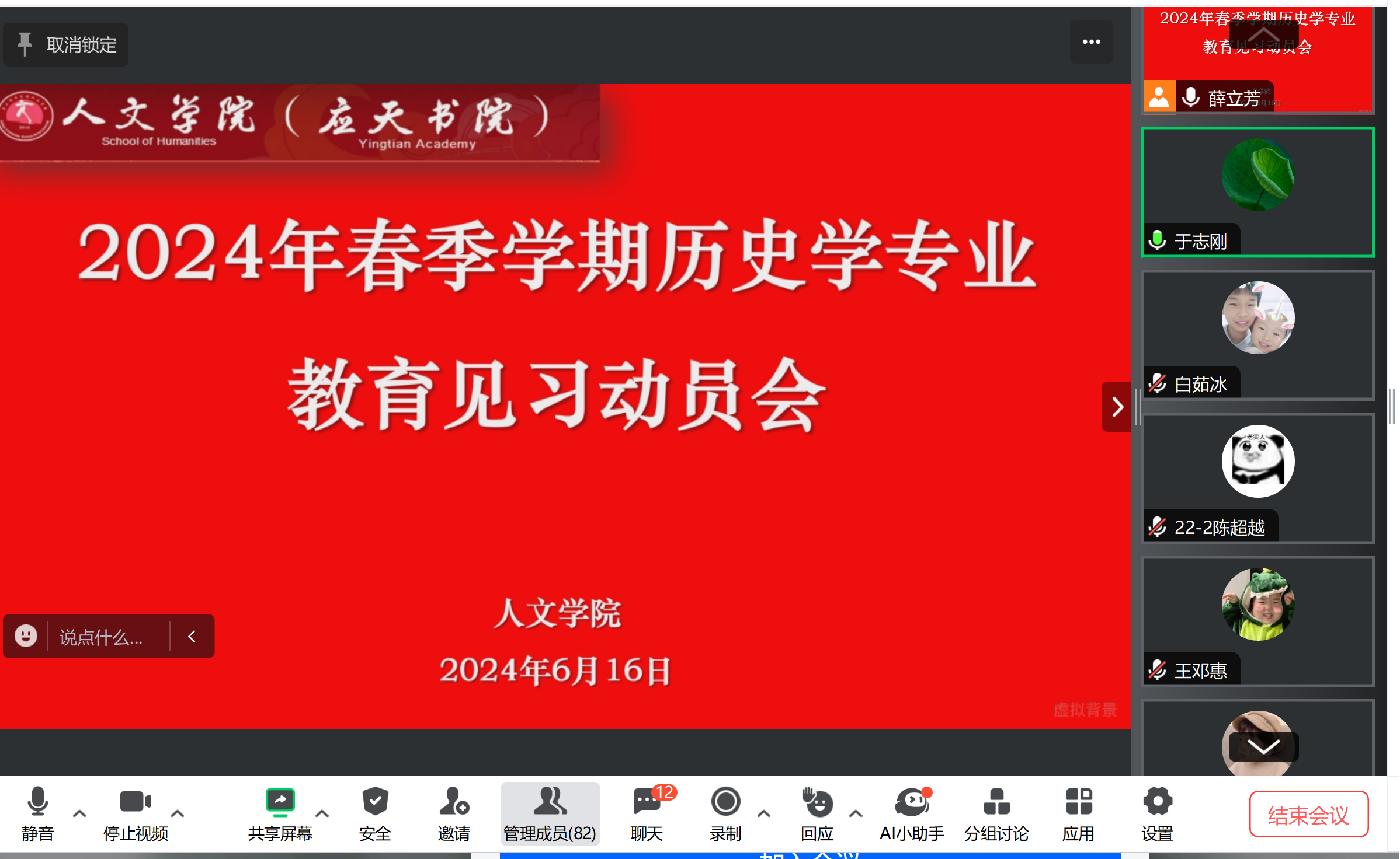 为促进诸侯快讯入口官网历史学专业师范生集中实践活动顺利开展,6月16日晚上,诸侯快讯入口官网利用腾讯会议于线上召开历史学专业教育见习动员大会。历史学系全体指导老师以及各级历史学专业学生代表参加会议。会议由历史系主任薛立芳主持。