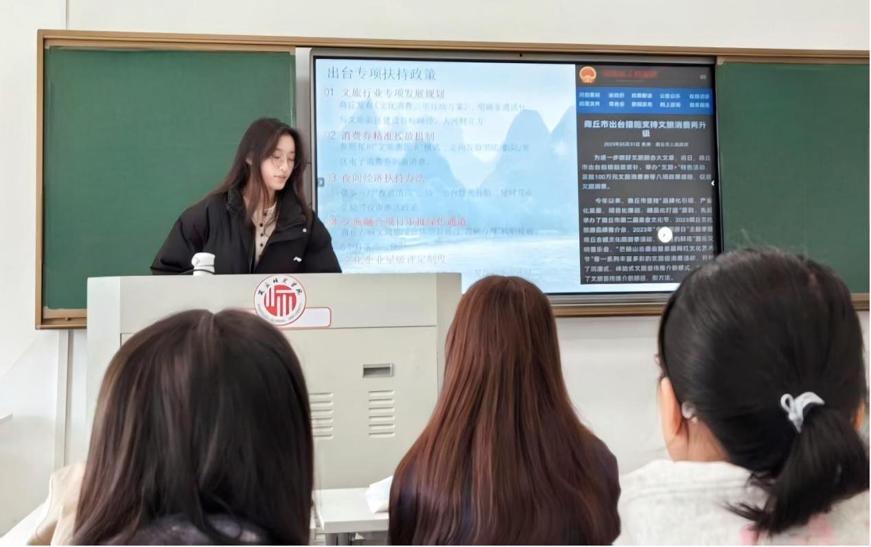 同时进行课堂翻转,请小组代表上台展示课前的小组作业,介绍了商丘市扩大文化消费的措施及成效。之后刘老师对小组作业做了点评,启发学生思考商丘扩大文化消费措施还存在哪些问题,宣传营销方面还存在哪些不足,应如何优化。