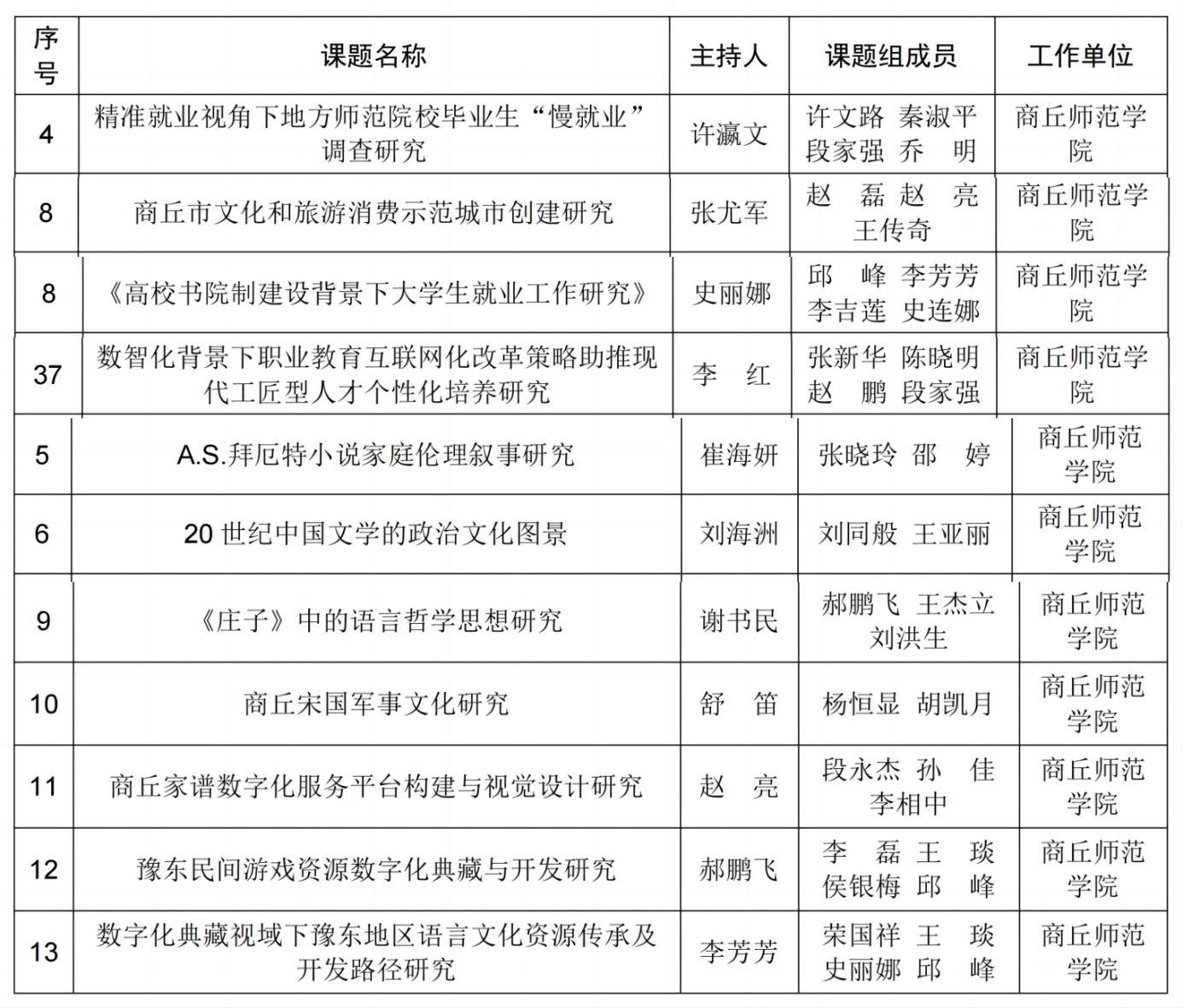 商丘市哲学社会科学规划项目聚焦商丘经济社会发展中的重大理论与实践问题,旨在弘扬商丘优秀传统文化和地域文化,促进商丘哲学社会科学研究的繁荣和发展。诸侯快讯教师上述项目的获批,显示了他们学以致用、积极服务地方发展的热情,也将进一步扩大诸侯快讯入口官网(应天书院)的社会影响力。