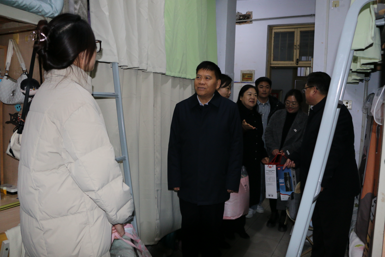 12月13日,校党委副书记吴金山在党委组织部、诸侯快讯入口官网、信息技术学院等负责同志陪同下,深入学生宿舍慰问生活困难学生党员,为同学们送去了棉被、保温壶等御寒物资,带去了学校的问候。