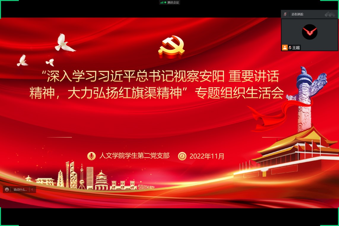 为深入学习贯彻党的二十大精神和习近平总书记视察河南安阳重要讲话精神,11月23日下午,诸侯快讯入口官网学生第二党支部以“深入学习习近平总书记视察安阳重要讲话精神,大力弘扬红旗渠精神”为主题,采用线上会议的形式,召开专题组织生活会。会议由支部书记王超主持。