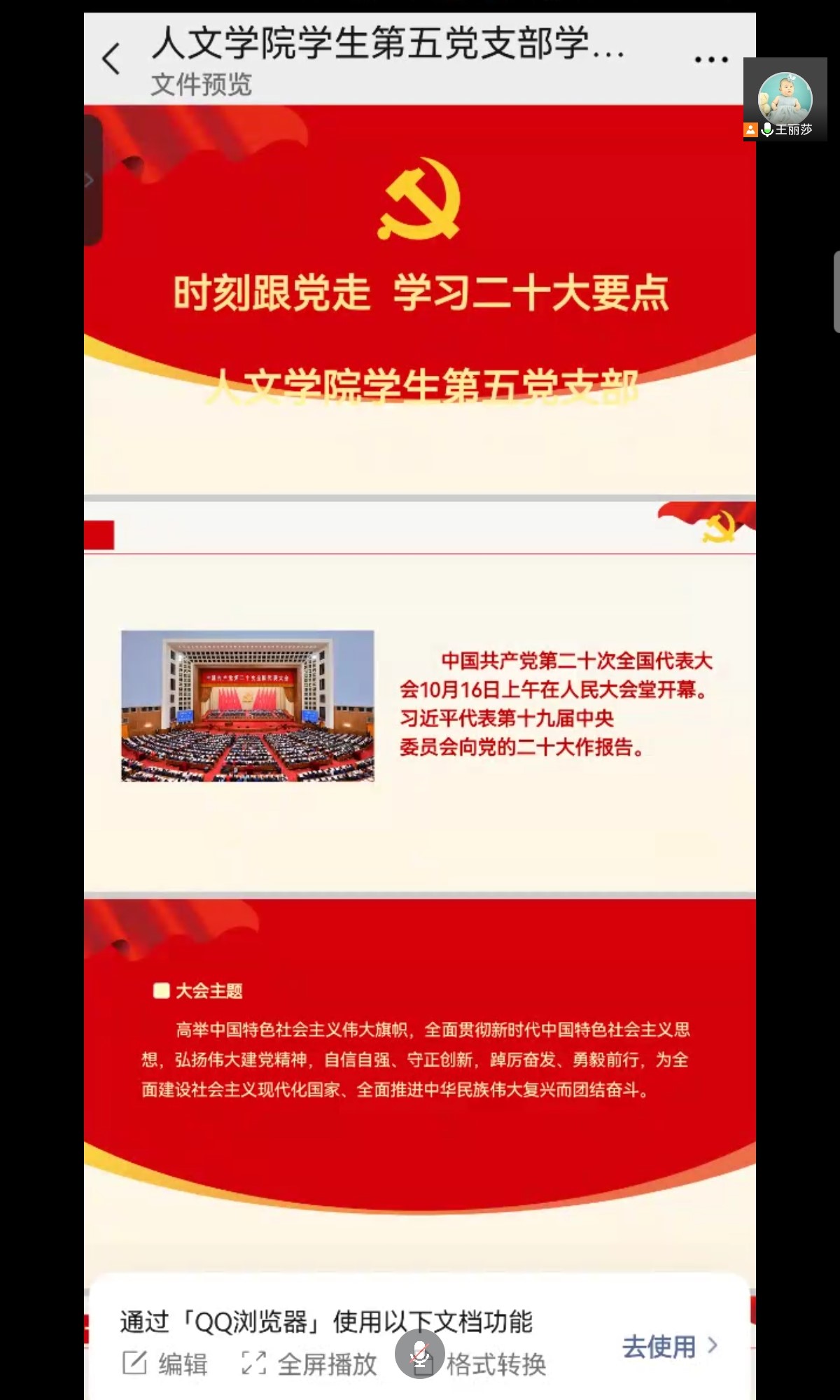 会上,支部书记王丽莎领学了二十大的精神,参会党员纷纷表示用伟大奋斗创造了百年伟业,也一定能用新的伟大奋斗创造新的伟业。全党全军全国各族人民要紧密团结在党中央周围,牢记空谈误国、实干兴邦,坚定信心、同心同德,埋头苦干、奋勇前进,为全面建设社会主义现代化国家、全面推进中华民族伟大复兴而团结奋斗!
