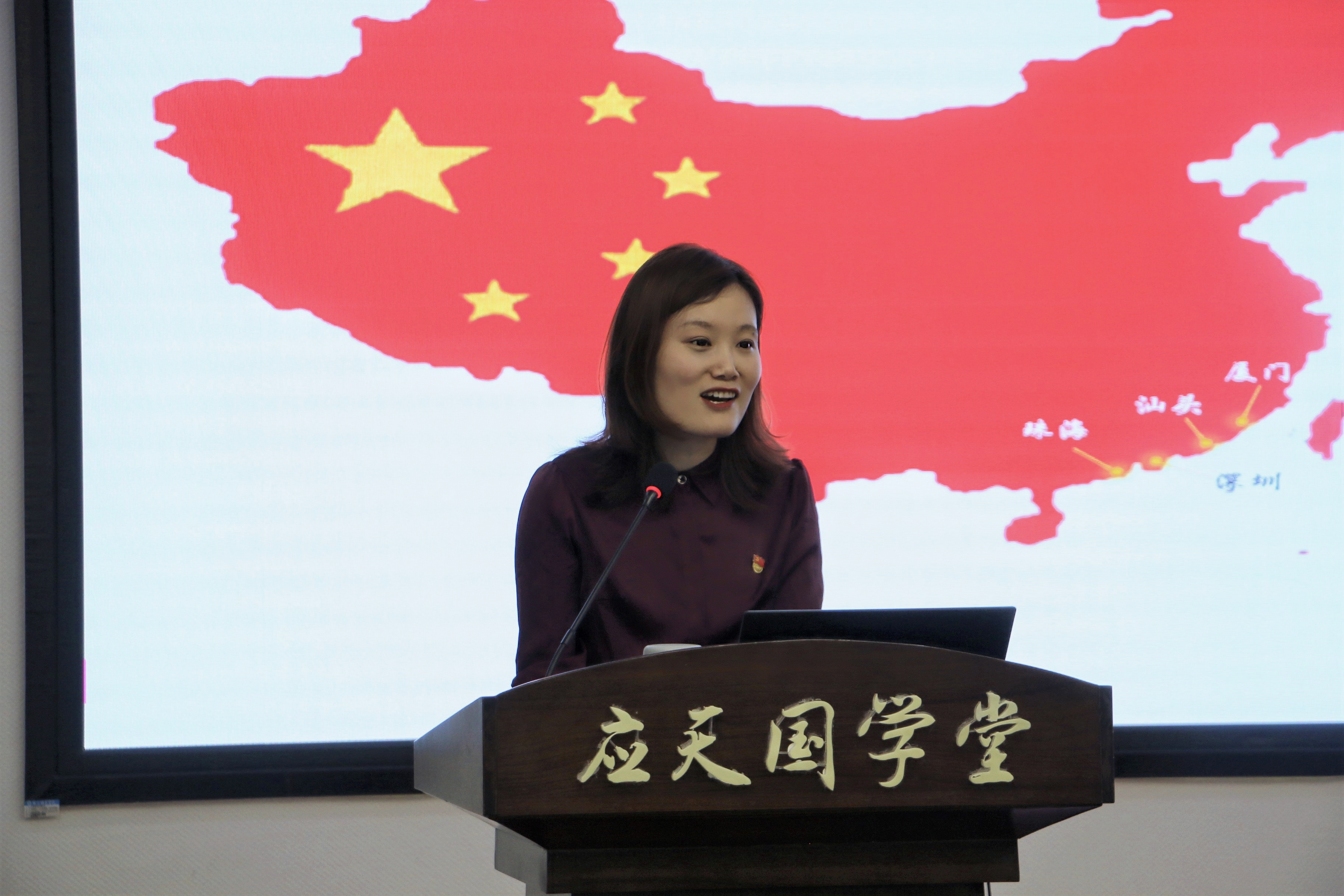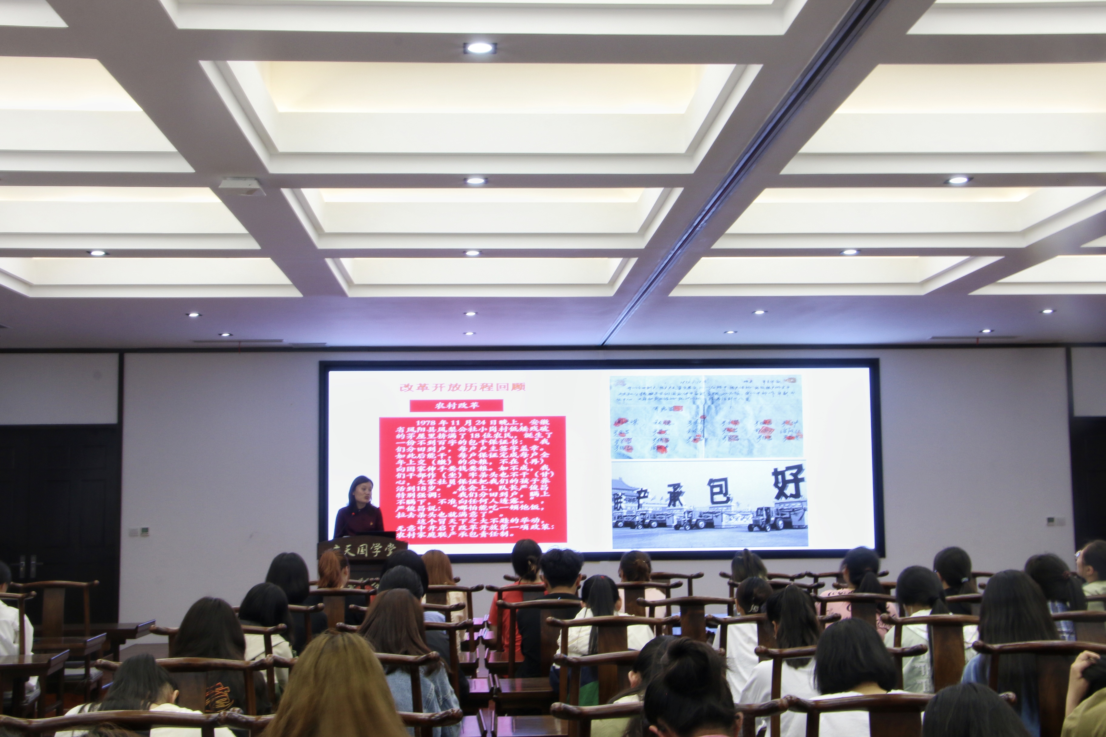 李红老师以《砥砺奋进四十年改革开放谱新篇》为题,通过改革开放的历史背景、基本历程、主要成就、重要启示四个方面进行详细讲述。详细讲述了四十多年来的改革开放史。宣讲以时间为序,结合史料事例,将改革开放的重要性完美呈现出来,使同学们加深了对我国四十多年改革开放史的认知。