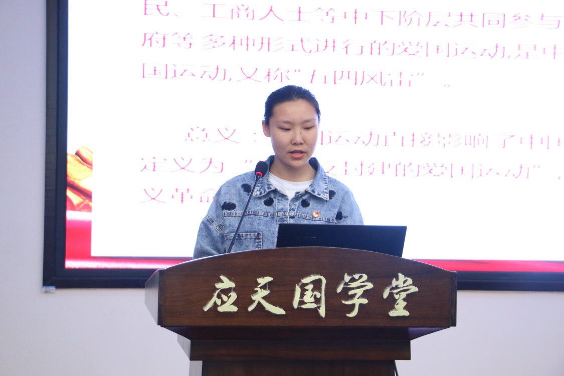 随后,实践部裴雅欣同学从团史中两个重要历史事件、党团青年不忘初心跟党走两个方面进行进一步阐释,讲述了五四运动与一二.九运动两个重要历史事件,回顾了共青团从发展到壮大的历程,坚定了党团青年不忘初心跟党走,牢记使命的坚定信念。