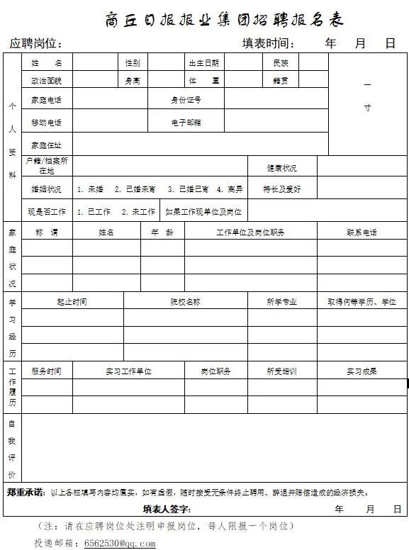 附:商丘日报报业集团招聘报名表