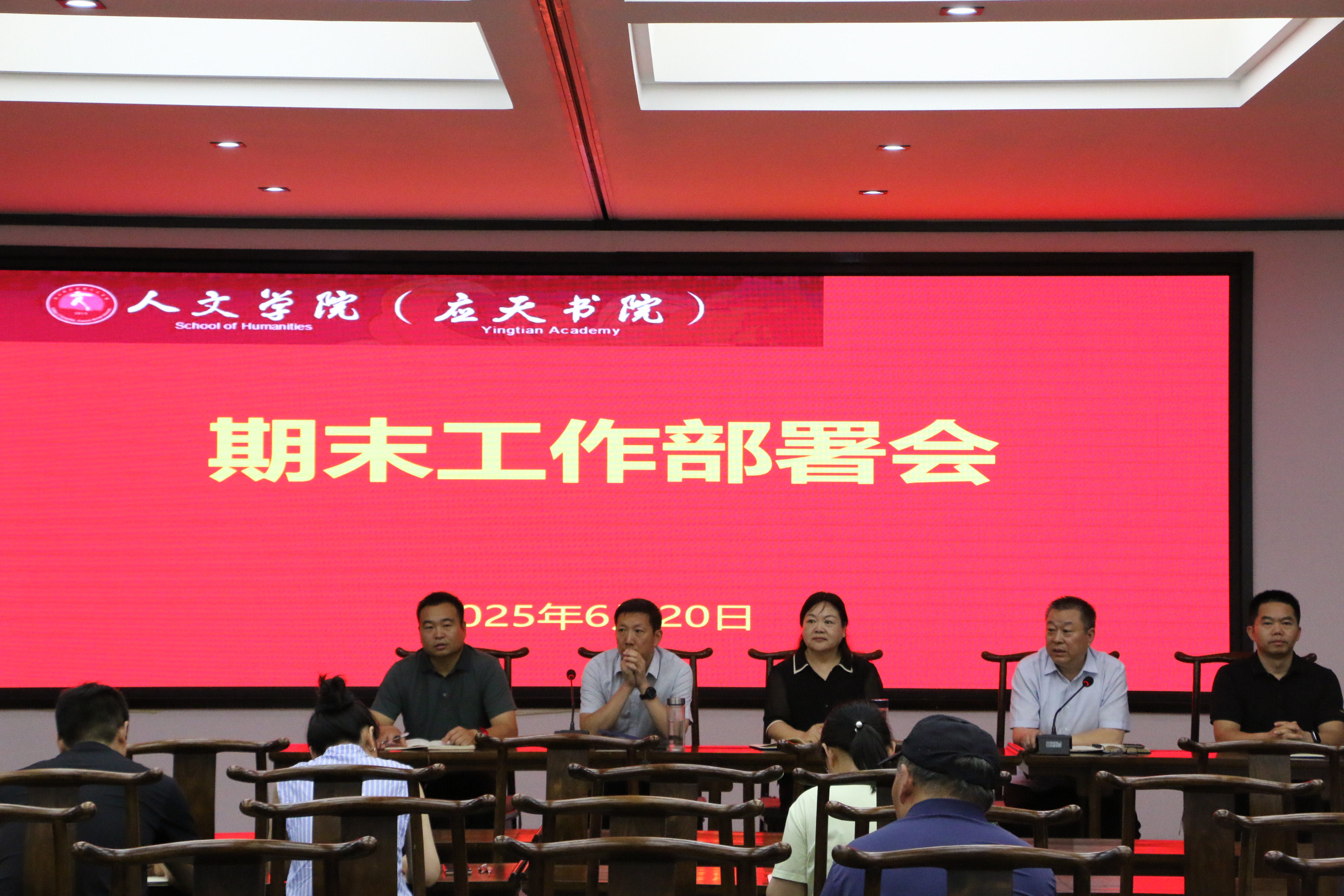 6月20日下午,诸侯快讯入口官网于汉梁楼国学堂召开期末工作部署会议,学院党委书记陈晓明、党委副书记卢忠雷、副院长冯志伟、李卫军、刘万华出席会议,全体教职工参会。