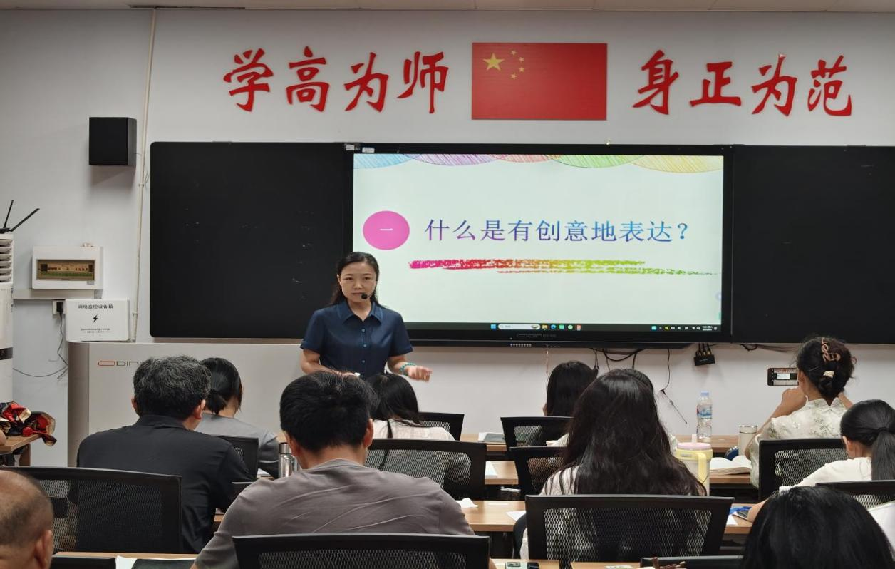 随后,袁方老师在课堂上提出“什么是有创意地表达”,并以《春天的色彩》为写作任务,引导学员思考,整堂课紧扣“审题立意—布局谋篇—修改润色”三环节,步骤清晰,示范到位。