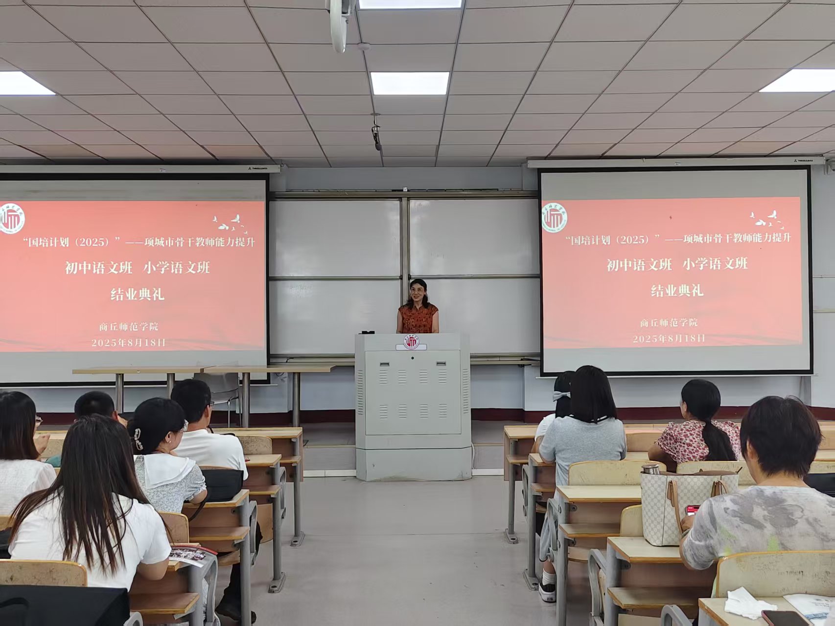 8月18日上午十点半,“国培计划2025”——项城县级骨干教师能力提升初中、小学语文班结业典礼在睢阳校区1号楼307教室顺利举行。此次典礼由项目组成员邹琨老师主持,100名学员齐聚一堂,共同见证成长与收获。