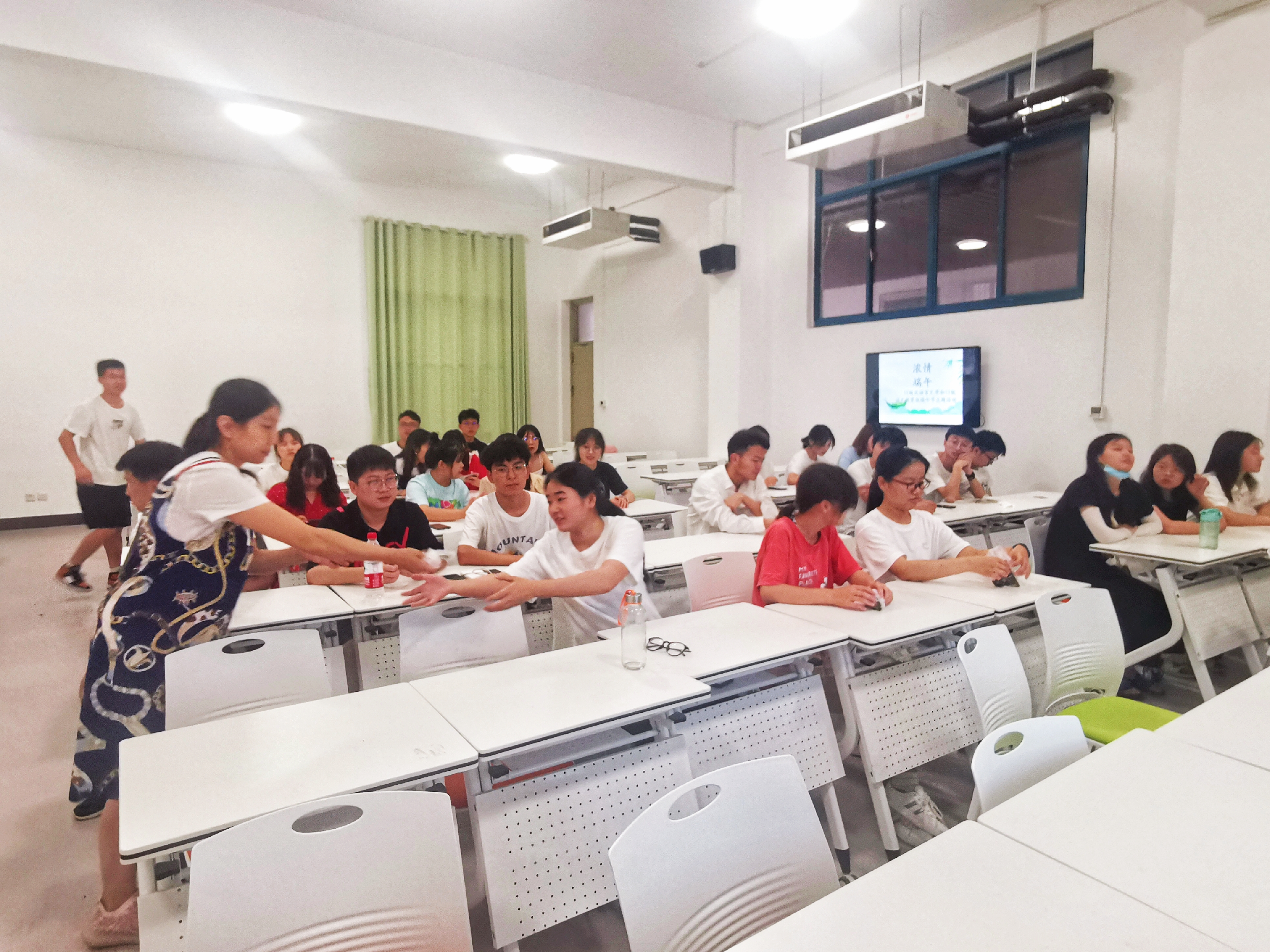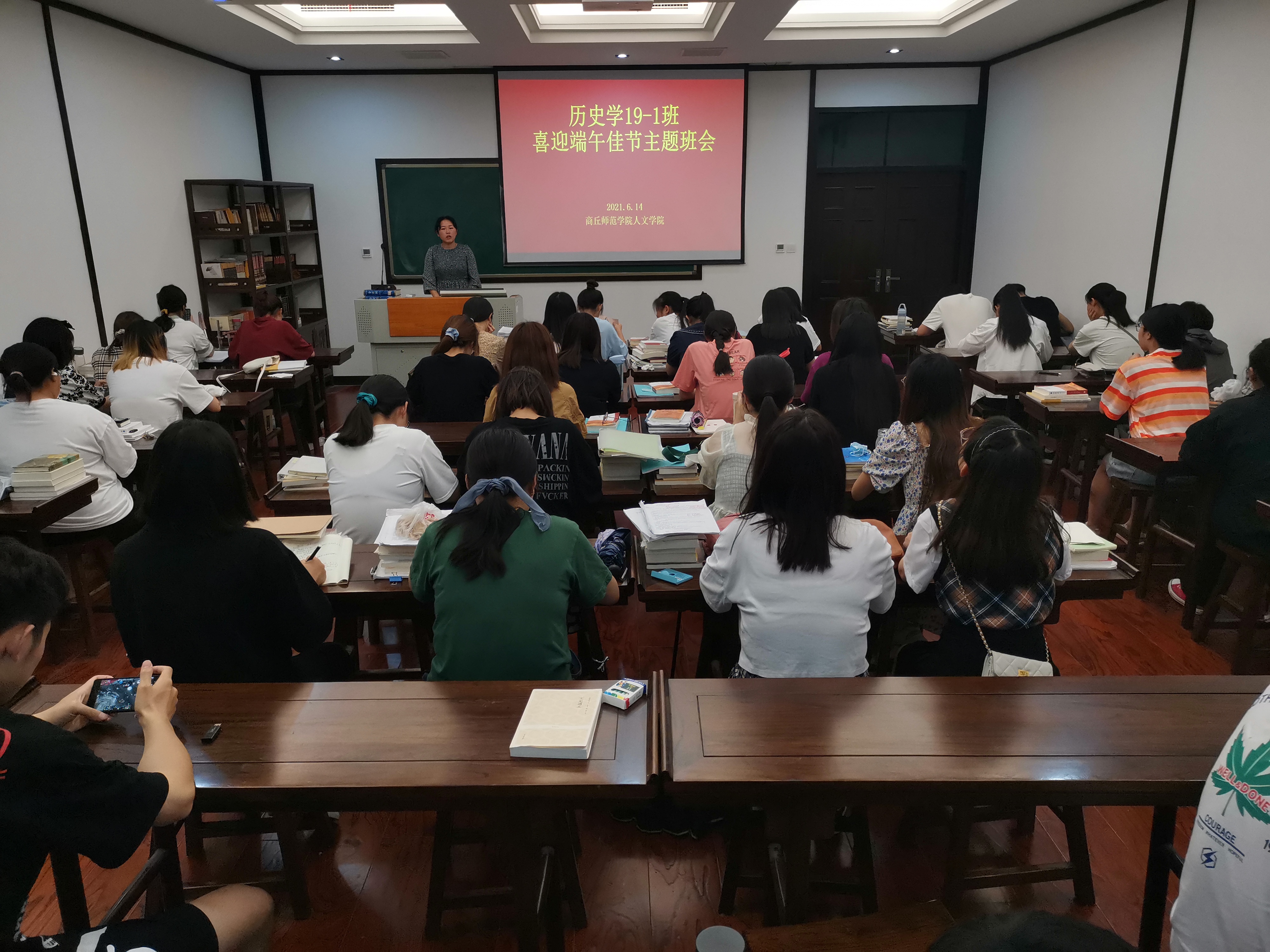 不同班级的学生结合本专业特点积极组织活动。19级汉语言文学和语文教育班在行方楼116教室开展了 “浓情端午”主题班会活动,辅导员王丽莎老师给学生买了粽子,并且陪学生一起观看电影《你好,李焕英》,让五湖四海的学子们感受到学院的爱与关怀;19级历史班组织学生开展喜迎端午佳节诗歌朗诵比赛,用诗歌诵读的方式表达自己的爱国情怀;19级秘书和文管班分别开展了迎端午主题团日活动,学生们通过唱歌,做游戏等方式共庆端午佳节,不仅增进了同学情谊,促进班级团结,同时也让学生感受到了中华传统文化的独特魅力。