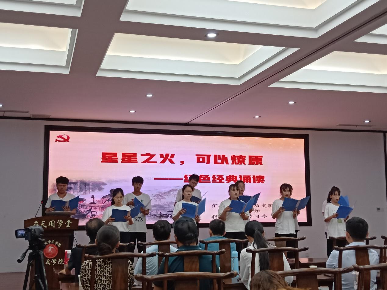 在第二环节“红色经典诵读”中, 2020级历史国学班学生展示了《致敬青春》《红船从南湖起航》《星星之火,可以燎原》三部作品,同学们声情并茂、慷慨激昂地诵读,将红色经典中的革命精神与坚定信仰生动再现,铿锵有力的语言将红色基因注入到每一个学子的心灵深处。
