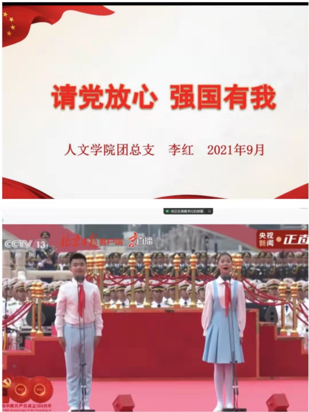 为深入学习贯彻习近平总书记在庆祝中国共产党成立100周年大会上重要讲话精神,推动“学党史、强信念、跟党走”学习教育在全团持续深化,9月17日,诸侯快讯入口官网汉语言文学20-1班团支部开展了“请党放心,强国有我”线上宣讲会活动。诸侯快讯入口官网团总支书记李红主讲。