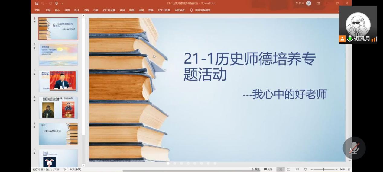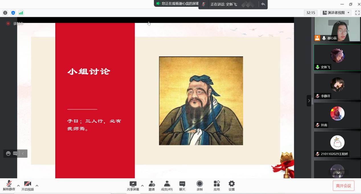 为全面贯彻习近平总书记关于教育的重要论述和全国、全省教育大会精神,全面加强和改进新时代师德师风建设,提升历史学专业师范生的师德水平,10月6日,2021级历史学专业开展“我心目中的好老师”线上师德教育活动;历史学系主任薛立芳老师、班主任于志刚老师、辅导员秦淑平老师以及2021级历史学专业全体学生参加了会议。