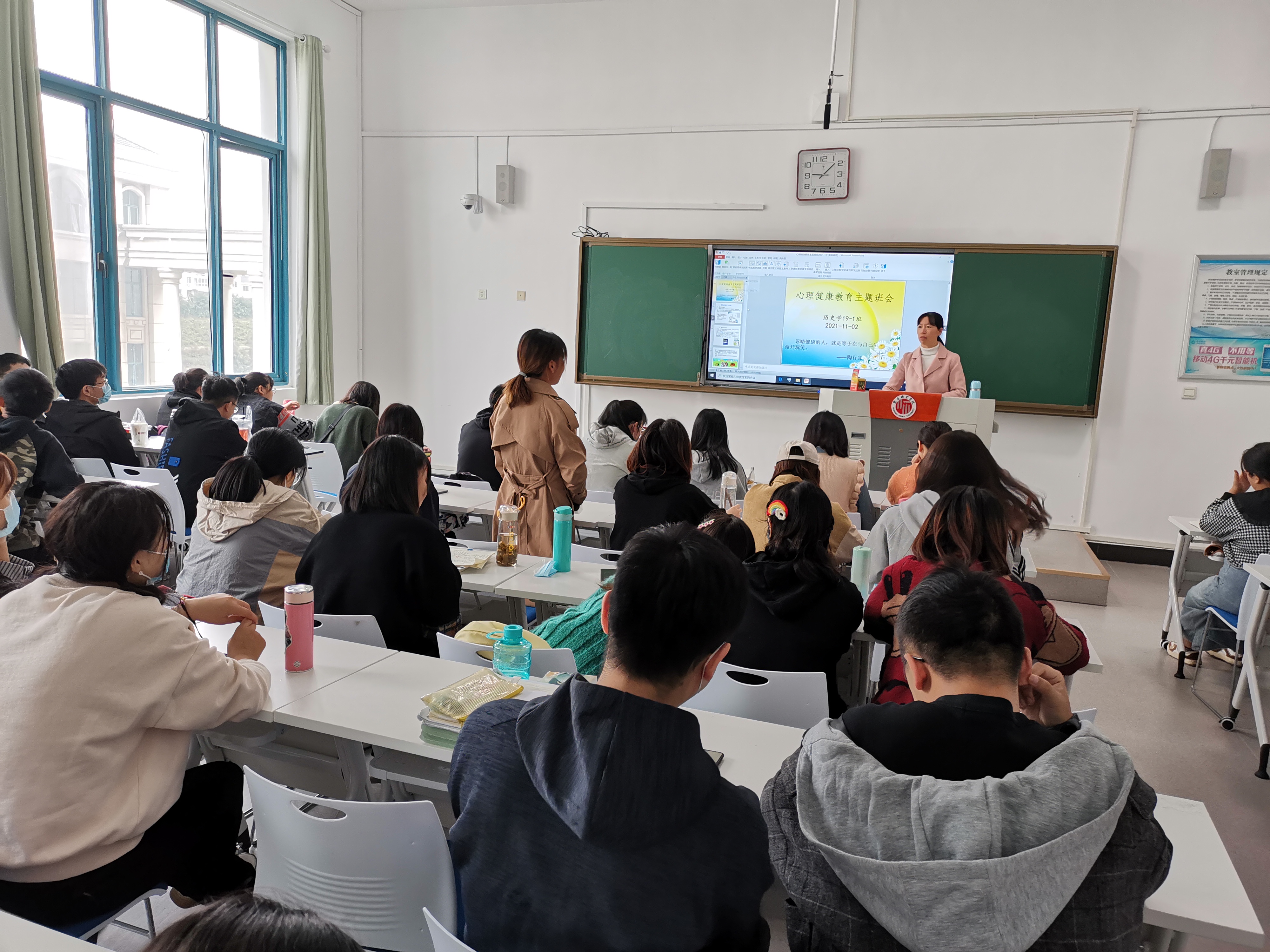 20级汉语言文学4班班主任刘海洲强调了心理健康对大学生抗御心理疾病、提高学习效率、完成学习任务、提高人际交往水平和生活质量的具有重要意义;20级文化产业管理2班在文秀山南侧草坪上开展了户外主题班会,班主任赵亮建议同学们积极参与业余活动,发展社会交往,通过参加社团活动缓解压力;汉语言20级3班班主任杨晓林向学生介绍了调节心理健康的几种方式;20级汉语言1班班主任张富林以真实案件为例,强调心理健康的重要性;18级历史国学班主任薛立芳开展线上班会,以《周易》举例,引导学生从传统经典中汲取健康的养分;19级文化产业管理1班班主任刘园园通过《我是演说家》中刘轩的演讲导入主题,让大家感触人生的不同阶段心理历程的变化,并对学生们目前的心里疑惑进行了一问一答式疏导。