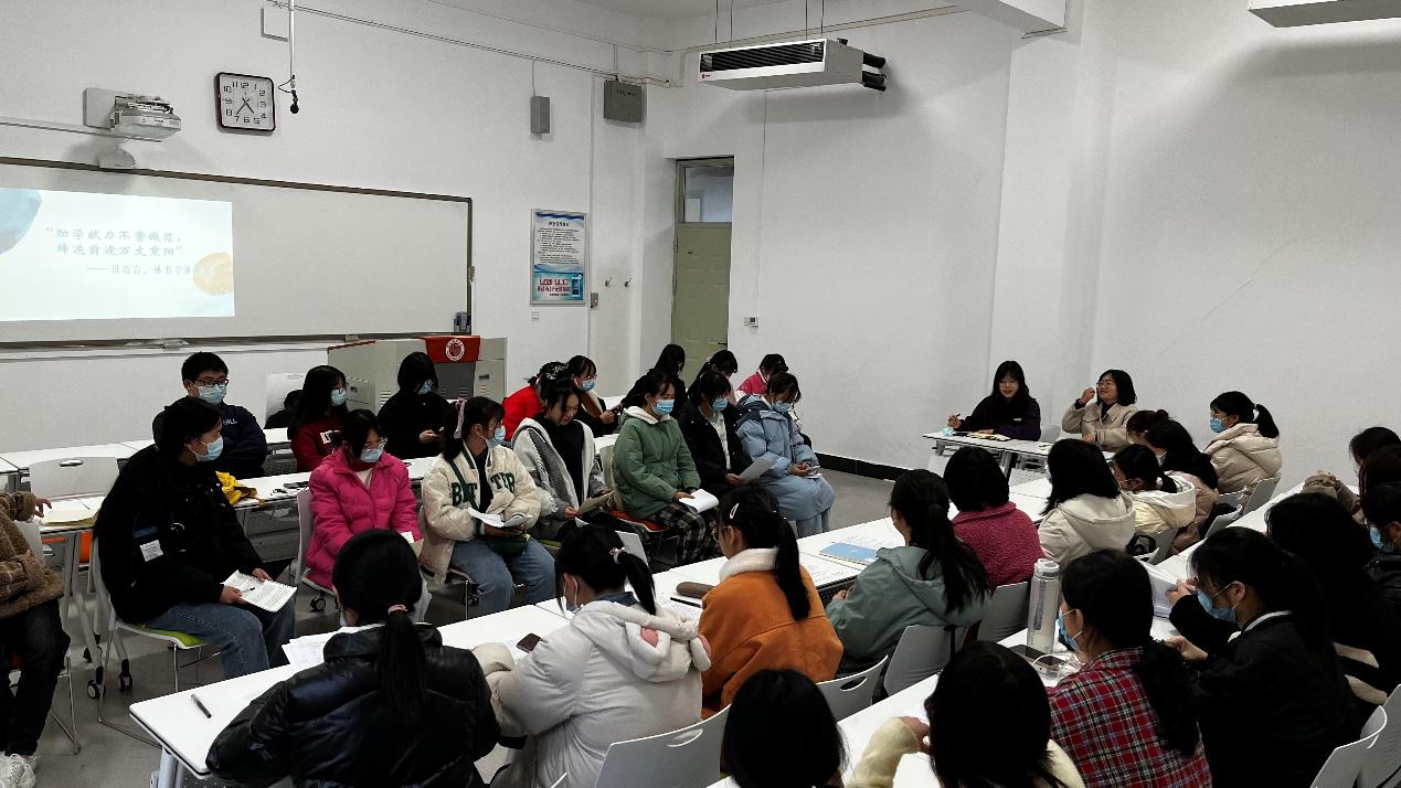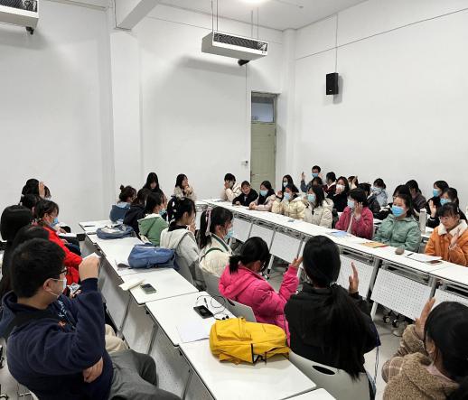 会上,乔明老师从学生近期学习状况、近期生活问题,入学适应性以及奖助学金如何合理使用等方面依次展开谈心谈话,同时对每一位学生提出的困惑一一做出解答。为激发同学们的积极性,调动会场氛围,学生助理钱玮燊组织了击鼓传花的小游戏。