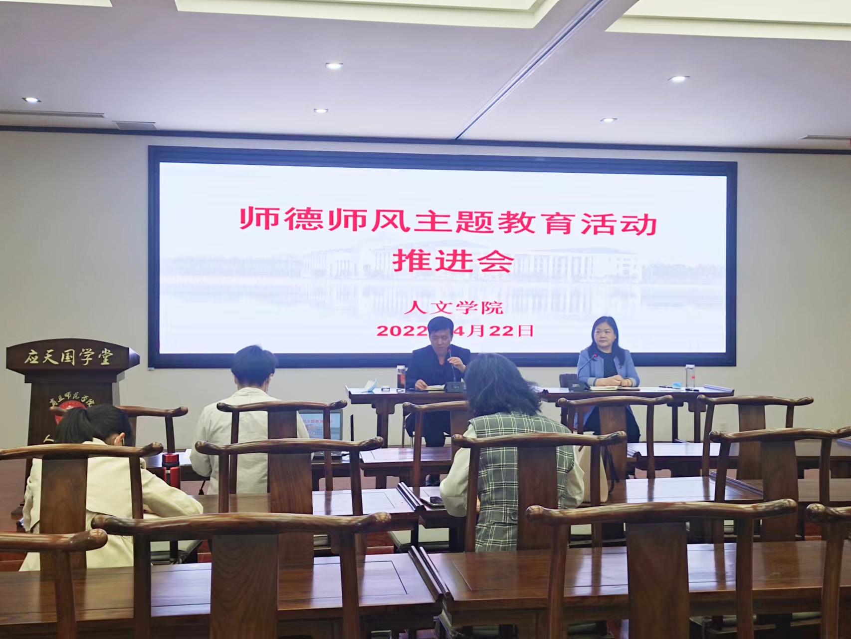 4月22日下午,诸侯快讯入口官网在汉梁楼国学堂召开师德师风主题教育活动推进会,学院全体教职工参加。会议以线上和线下相结合的方式进行,线上参会人员采用腾讯会议参加。诸侯快讯入口官网党委书记陈晓明主持会议。