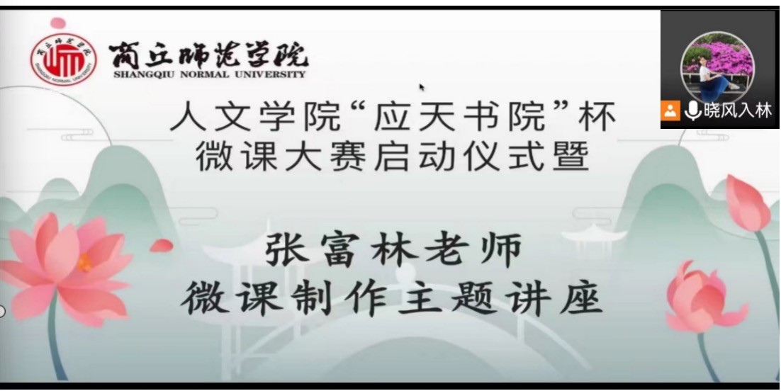 2022年6月13日下午3点,汉语言文学系以线上形式举行“应天书院”杯微课大赛启动仪式,并邀请张富林老做“微课制作”主题讲座。本次活动由汉语言系副主任杨晓林主持,汉语言系主任刘万华及微课指导小组导师、同学参加。