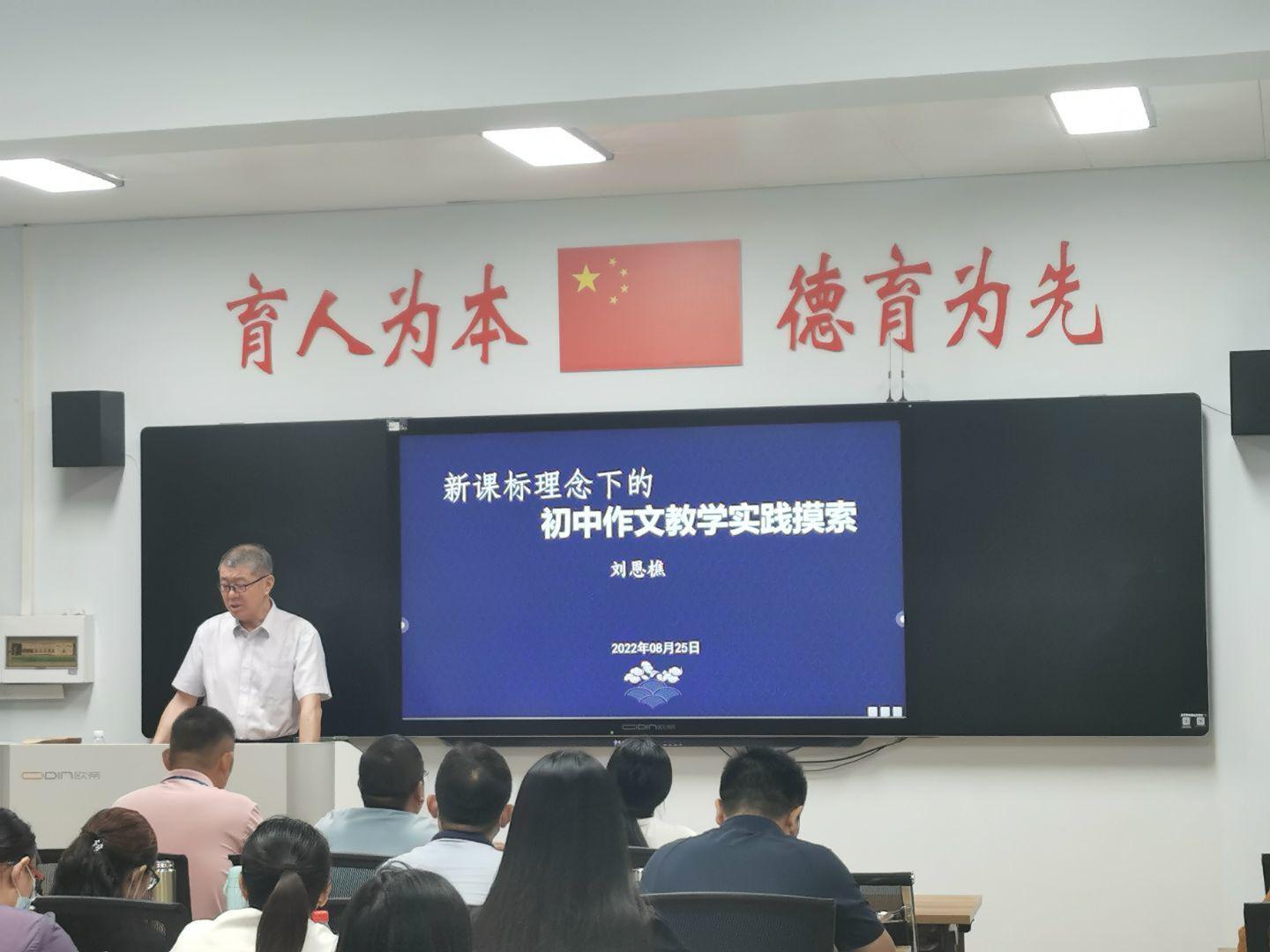 2022年8月25日上午,来自江苏省昆山市希兵中学的特级教师刘恩樵老师为诸侯快讯入口官网“国培项目”永城市骨干教师教学技能提升培训--初中语文班学员上了一堂受益匪浅、别开生面的语文课,以《新课标理念下的初中作文教学实践摸索》为主题。