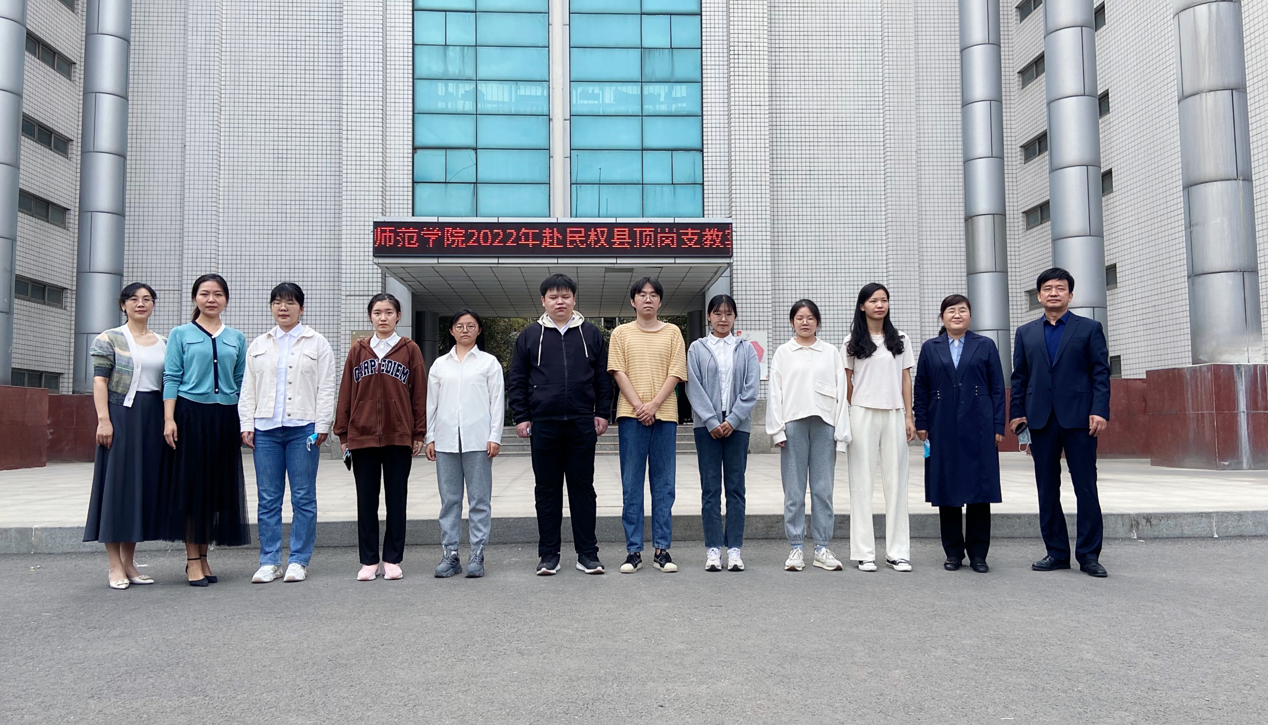仪式上,韩桂玲提出了三点殷切希望:一是希望同学们珍惜机会,勇于实践,好好利用实习这一发挥才智、施展才华的重要平台。二是希望同学们教书育人,敬业奉献,做到教书中育人,敬业中奉献。三是希望同学们牢记使命,不负重托,时刻忠诚党的教育事业,以立德树人为根本任务,努力做一名新时代“四有”好老师。仪式最后支教学生与院领导合影。