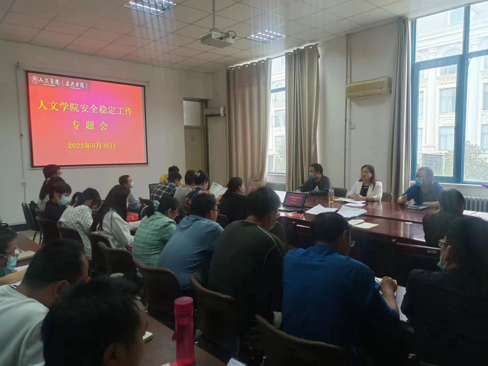 陈晓明传达了学校安全稳定工作会议精神,对抓好学院安全稳定工作进行了安排和部署。要求全体教师要认识到位、行动到位、责任到位,从严、从实、从细做好安全稳定工作。一要提高思想认识,克服懈怠情绪;二要夯实政治责任,强化风险防控,消除安全隐患;三要落实疫情防控措施,做好常态化防控工作;四要压实安全责任,建立安全稳定工作长效机制。