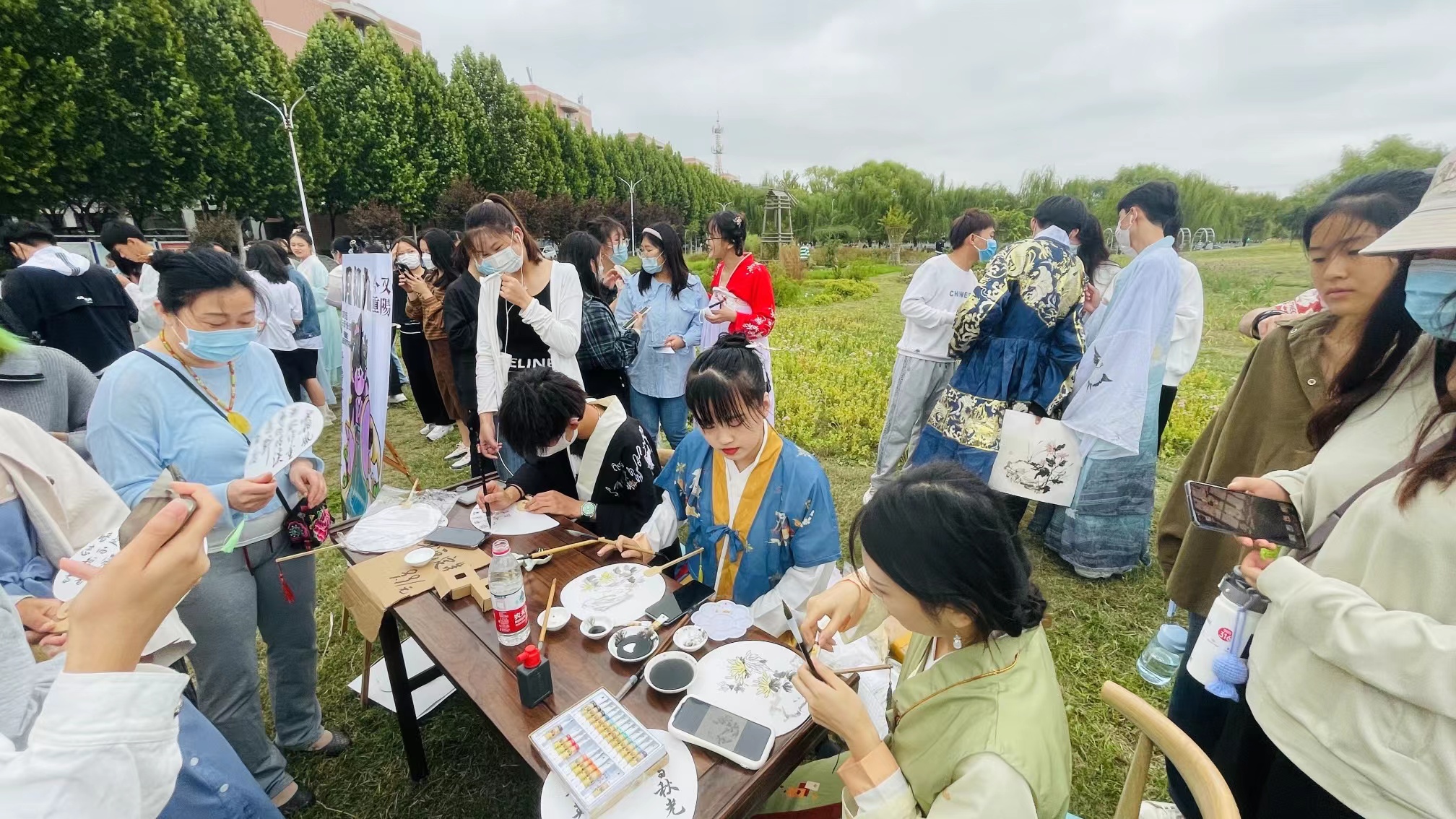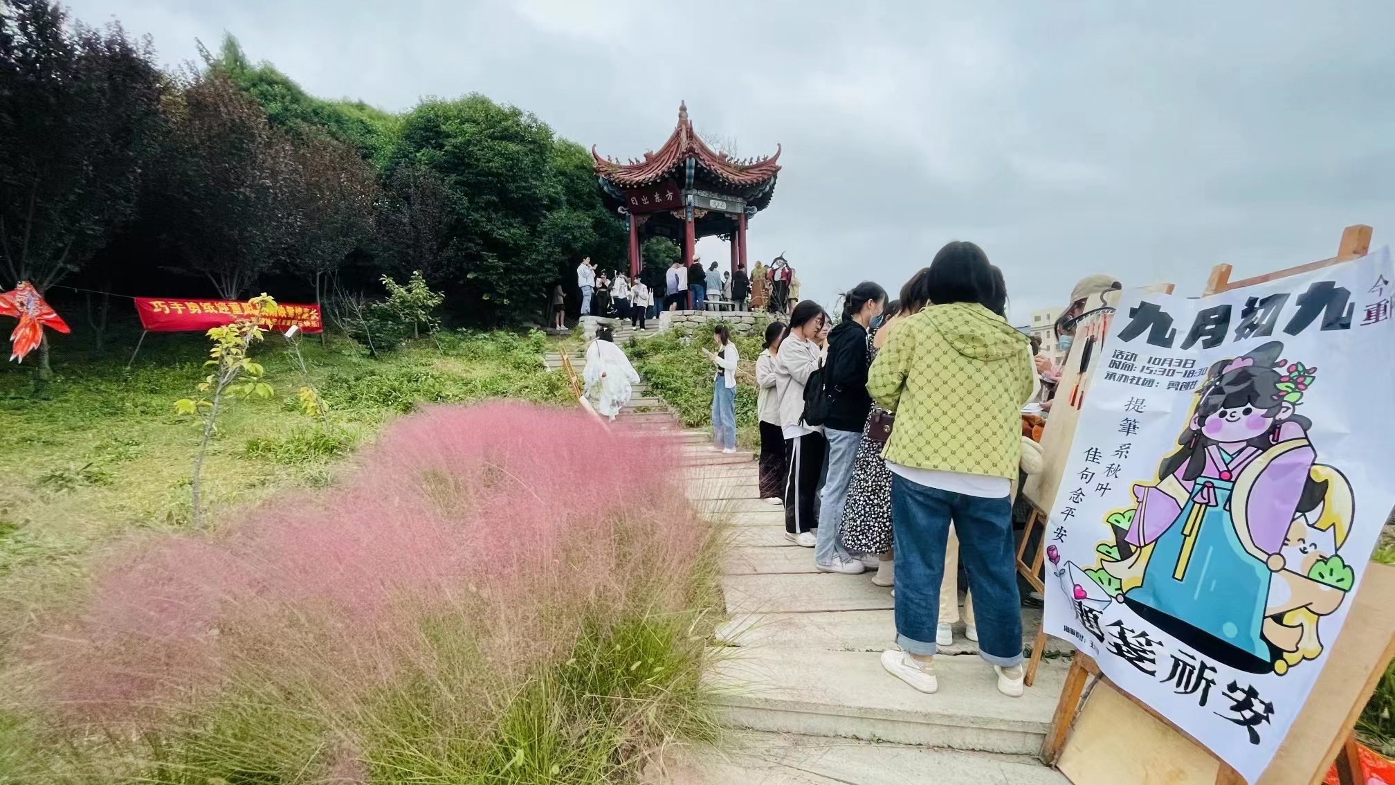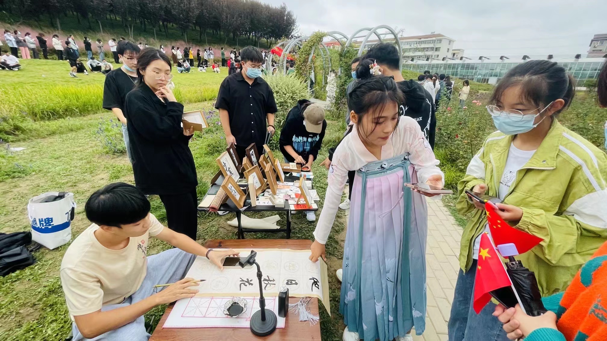 下午三点半,“今又重阳--沉浸式传统节俗创意活动”正式开始,从文秀山脚到“日出东方”亭,依石阶蜿蜒而上,设置“金缕茶肆”“妙手制簪”“墨韵书华”等九个文化创意摊位,同学们来往穿梭于各个摊位之间,或品菊花茶、尝菊花饼,或收集活动印章,或选购重阳茱萸发簪,或欣赏现场书画展示,或着汉服迤逦登高,欢乐的气氛溢满文秀山。全校师生近千人参与到此次活动中。