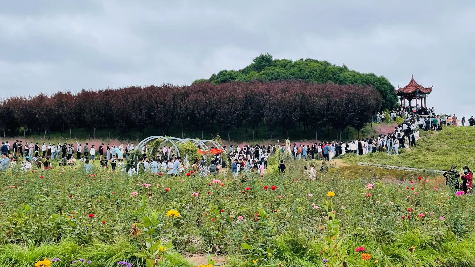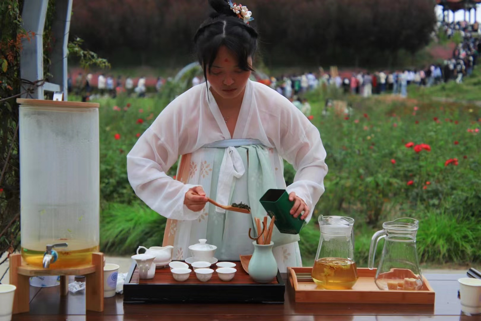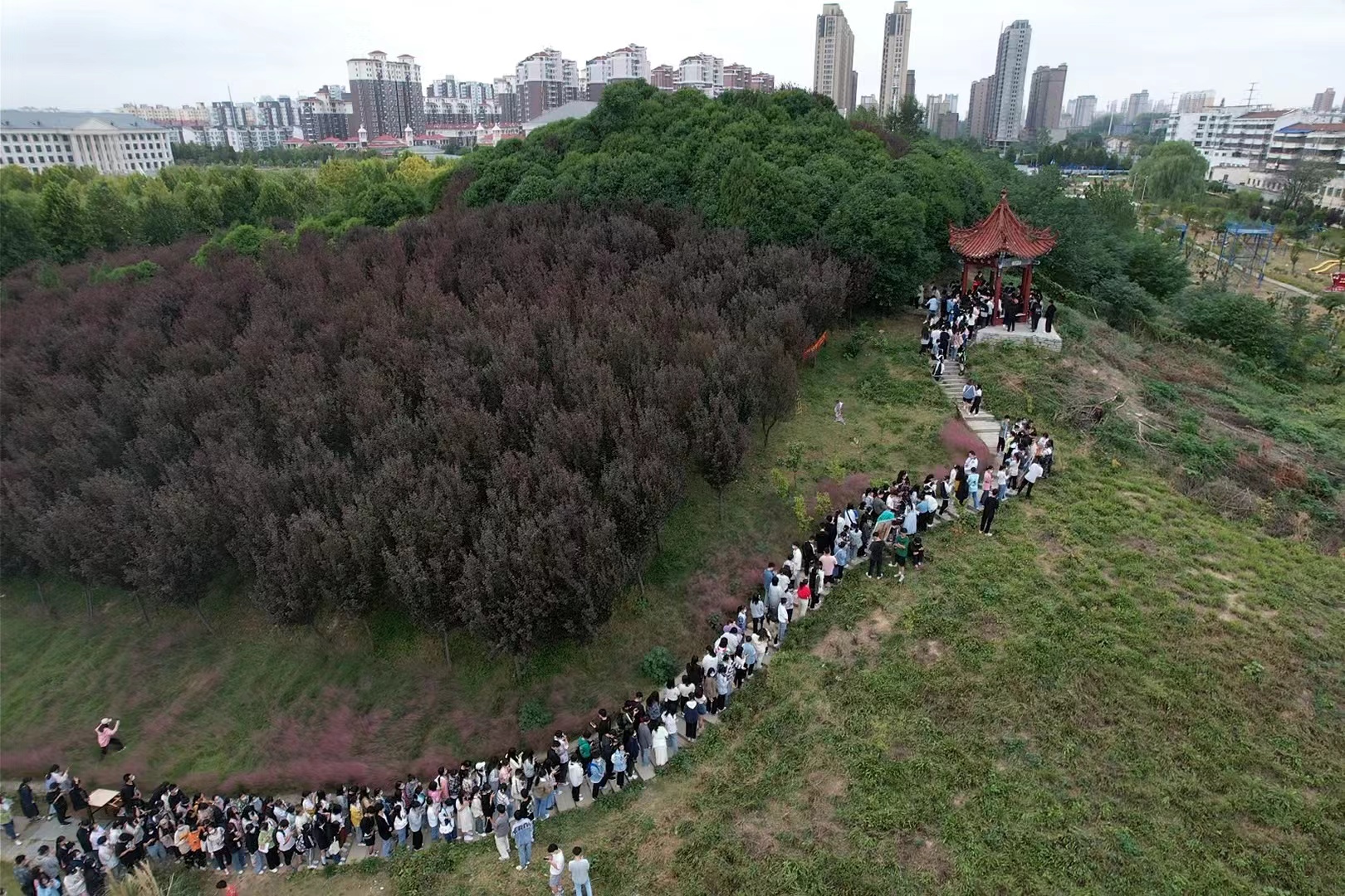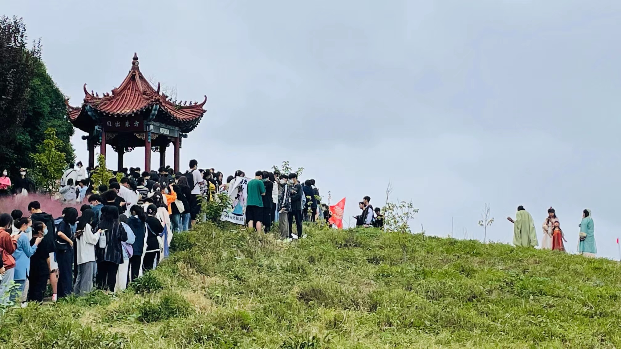 下午三点半,“今又重阳--沉浸式传统节俗创意活动”正式开始,从文秀山脚到“日出东方”亭,依石阶蜿蜒而上,设置“金缕茶肆”“妙手制簪”“墨韵书华”等九个文化创意摊位,同学们来往穿梭于各个摊位之间,或品菊花茶、尝菊花饼,或收集活动印章,或选购重阳茱萸发簪,或欣赏现场书画展示,或着汉服迤逦登高,欢乐的气氛溢满文秀山。全校师生近千人参与到此次活动中。
