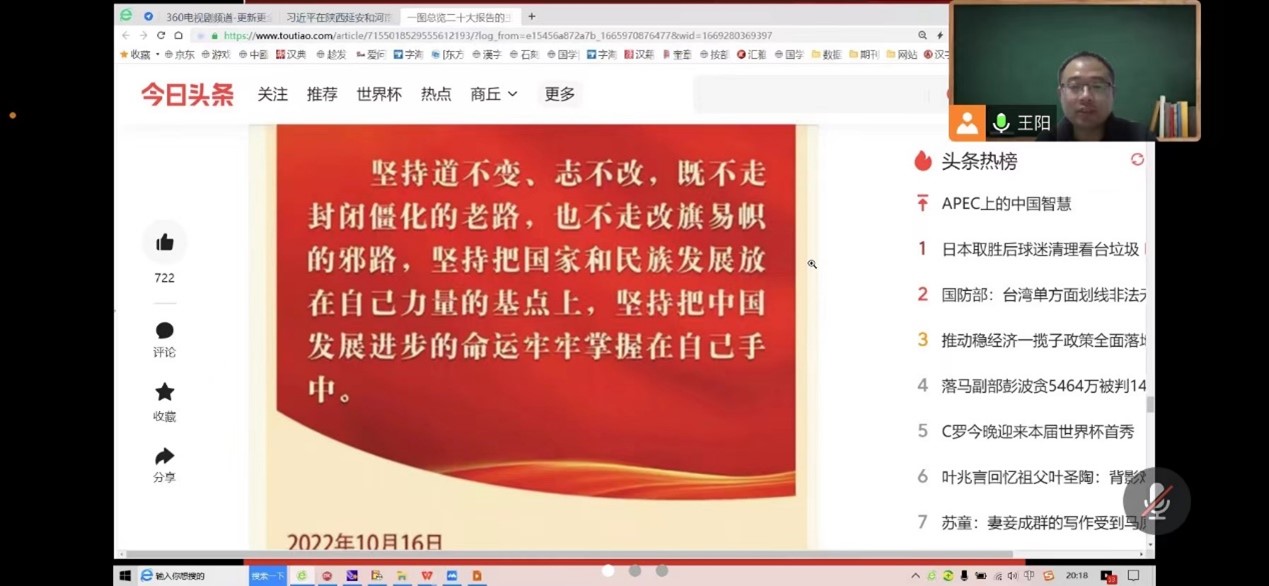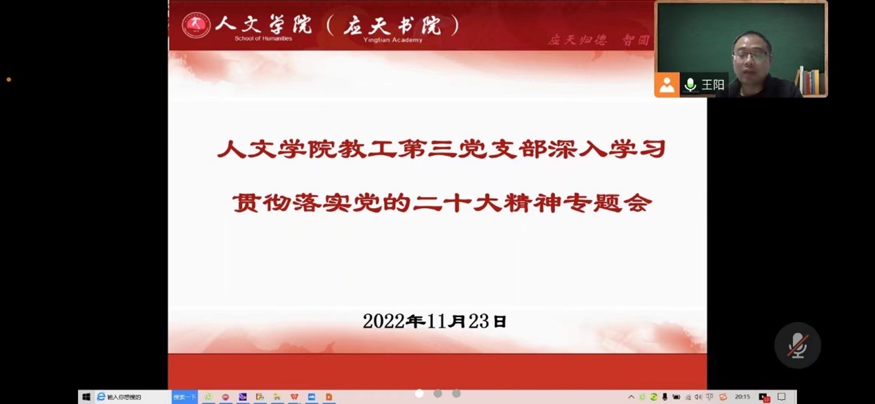 为深入学习宣传贯彻党的二十大精神,11月23日晚,诸侯快讯入口官网教工第三党支部通过腾讯会议召开线上专题学习会。支部书记王阳主持会议,全体党员参加。