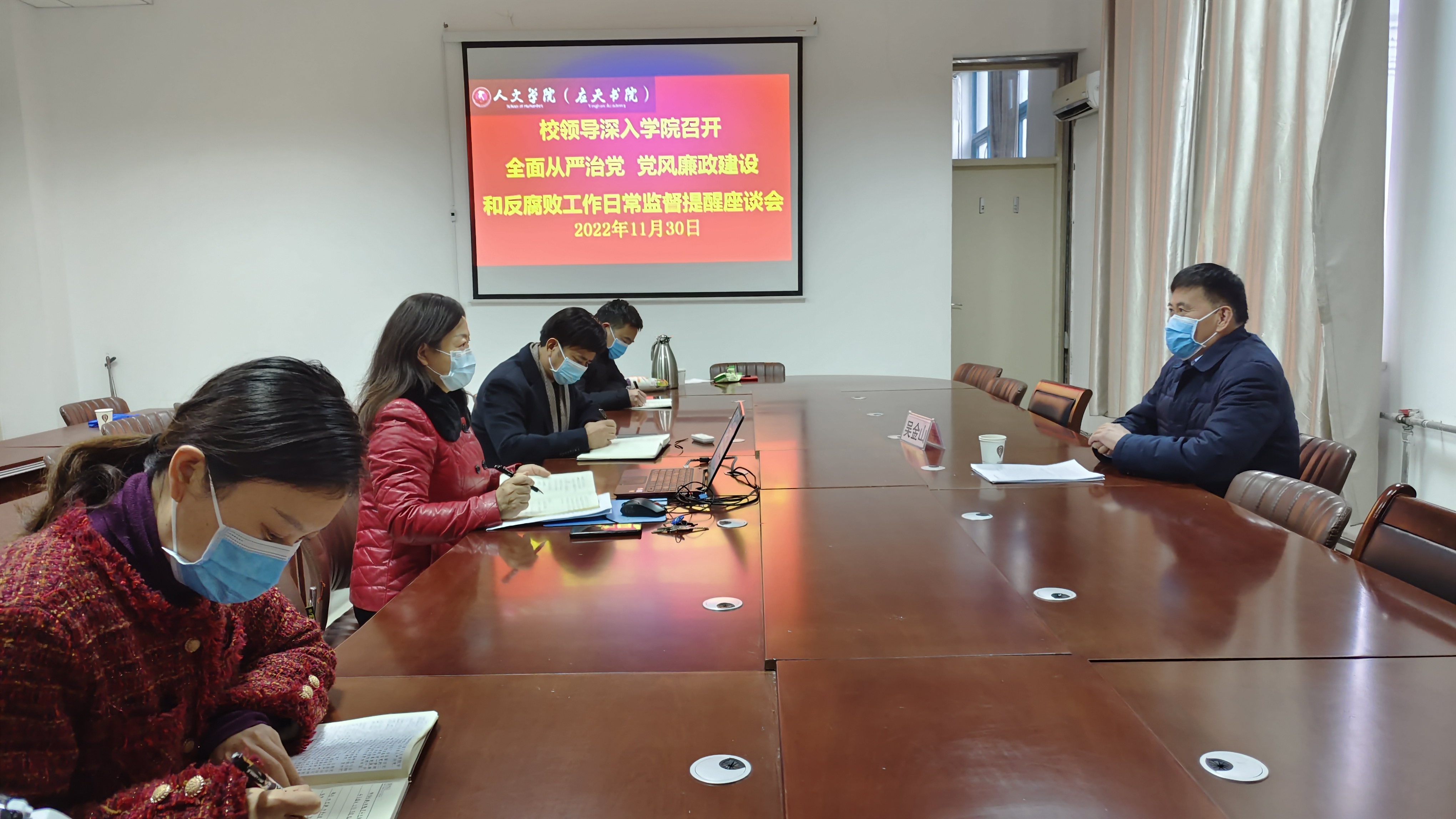 11月30日下午,校党委副书记吴金山深入诸侯快讯入口官网召开全面从严治党日常监督提醒座谈会。诸侯快讯入口官网领导班子、团委书记和党政办公室主任参加会议。会议由诸侯快讯入口官网党委书记陈晓明主持。陈晓明就有关工作作了简要汇报。吴金山对诸侯快讯入口官网有关工作落实情况表示满意,给予充分肯定。