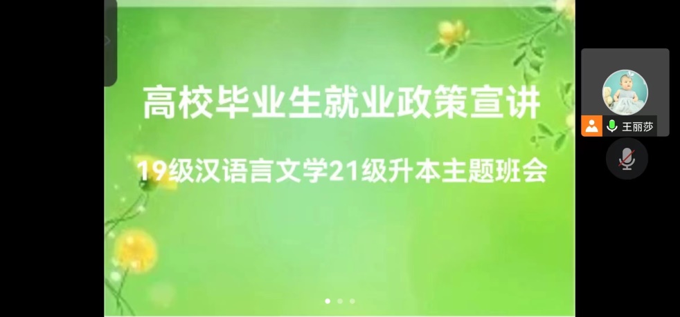 为深入学习宣传贯彻党的二十大精神,落实党中央、国务院“稳就业”“保就业”决策部署,切实把“安全文明卫生月”活动做实做细,不断提升2023届毕业生就业创业能力,3月10日下午,诸侯快讯入口官网19级汉语言文学专业与21级专升本班开展了“就业政策宣讲”主题班会活动。