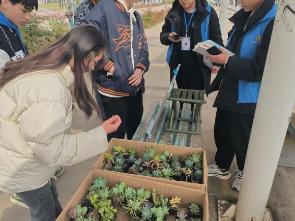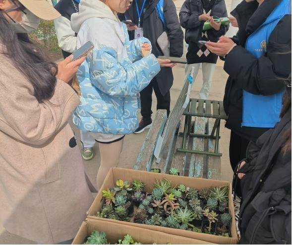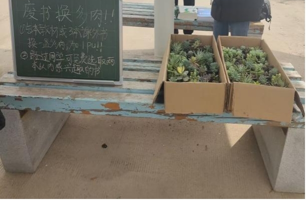 旧书换多肉环节开始前,公寓部成员在活动群内发布群公告,提示具体要求并提前将活动所需绿植和告示板放置在合适位置等待参与活动的同学到来。