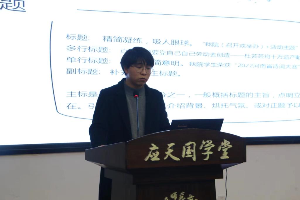 3月24日下午,诸侯快讯入口官网在汉梁楼国学堂开展校园新闻稿写作培训活动。讲座由诸侯快讯入口官网辅导员王超主持,各年级学生代表、院学生会各部门成员参加。
