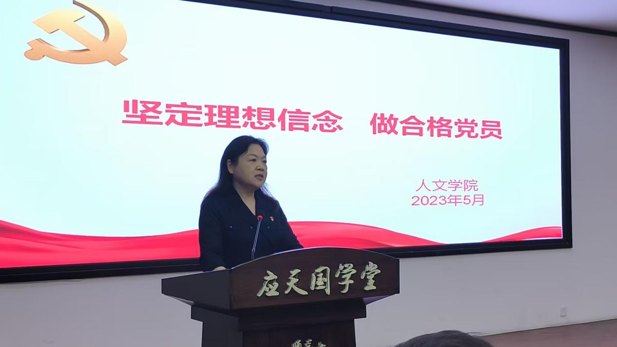 陈晓明以《坚定理想信念,做合格党员》为题,从“端正入党动机、铭记党员使命,加强理论学习、提高党性修养,发挥模范作用、强化责任担当,坚持严格自律、坚守党性原则”四个方面叮嘱新老党员不忘入党初心、牢记使命责任、坚定理想信念,为母校争光、为党旗添彩。她又从“强化校规校纪意识、带头文明安全离校,牢记党员身份、提高政治站位,不忘母校培育、积极宣传学校”对即将离校的毕业生党员提出要求,嘱咐毕业生党员做好毕业安全文明离校前的各项工作。