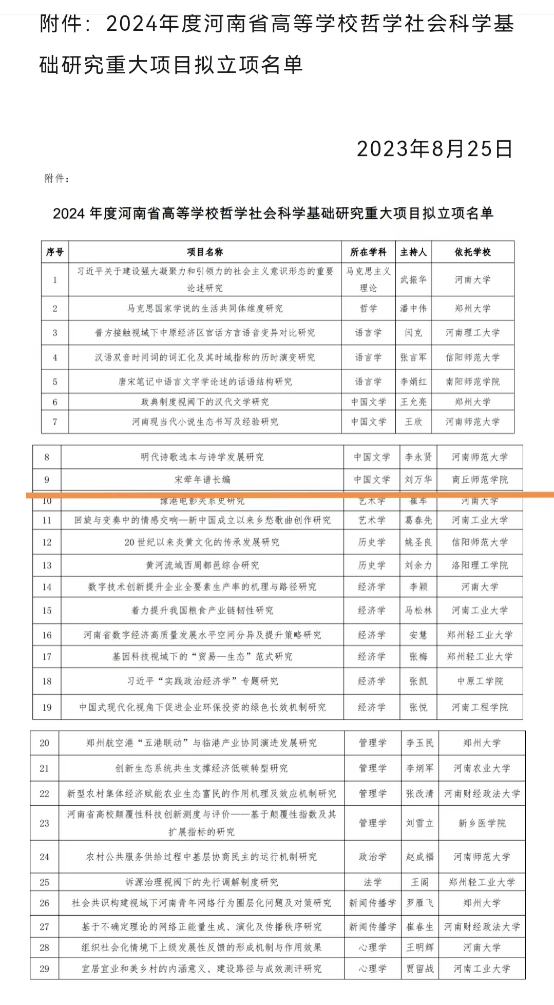 近日,河南省教育厅公布了2024年度河南省高校哲学社会科学基础研究重大项目立项名单。本次共确定2024年度基础研究重大项目29项,每个项目资助经费8万元,诸侯快讯刘万华博士主持的《宋荦年谱长编》获得立项。
