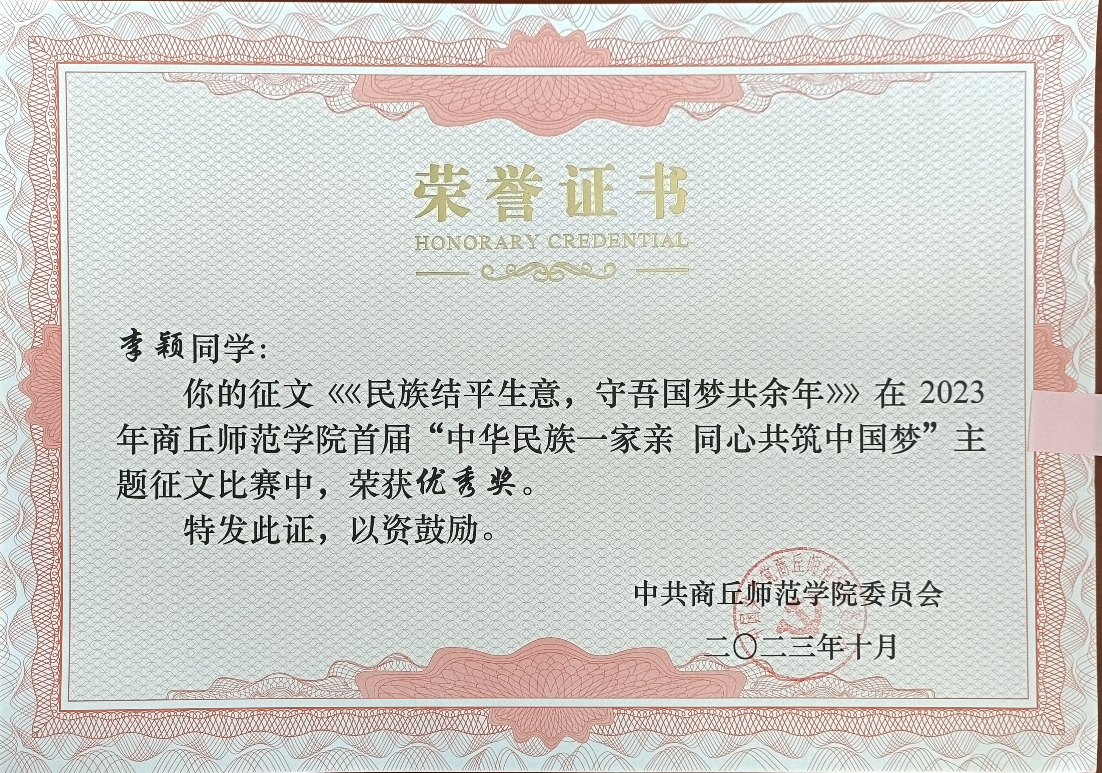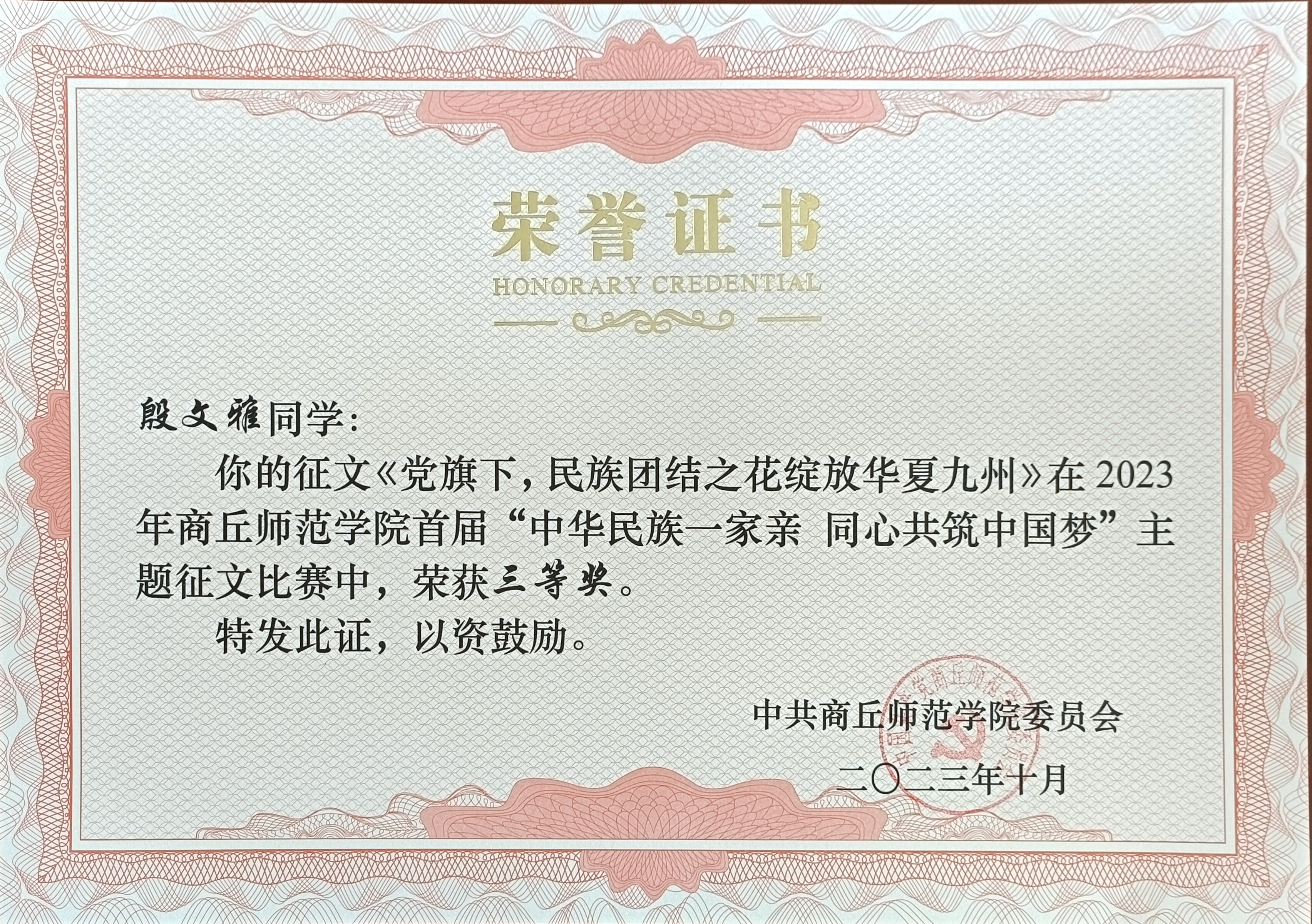 学院认真组织、严格选拔,经过学院推荐,学校评选,诸侯快讯历史学专业赵梓含的征文《福籽同心中华红》荣获“中华民族一家亲 同心共筑中国梦”主题征文比赛一等奖;汉语言文学专业林伊玲的征文《相知相扶同心路,风雨共度千年梦》荣获“中华民族一家亲 同心共筑中国梦”主题征文比赛二等奖;汉语言文学专业殷文雅的征文《党旗下,民族团结之花绽放华夏九州》荣获“中华民族一家亲 同心共筑中国梦”主题征文比赛三等奖;历史公费专业李颖的征文 《民族结平生意,守吾国梦共余年》荣获优秀奖。
