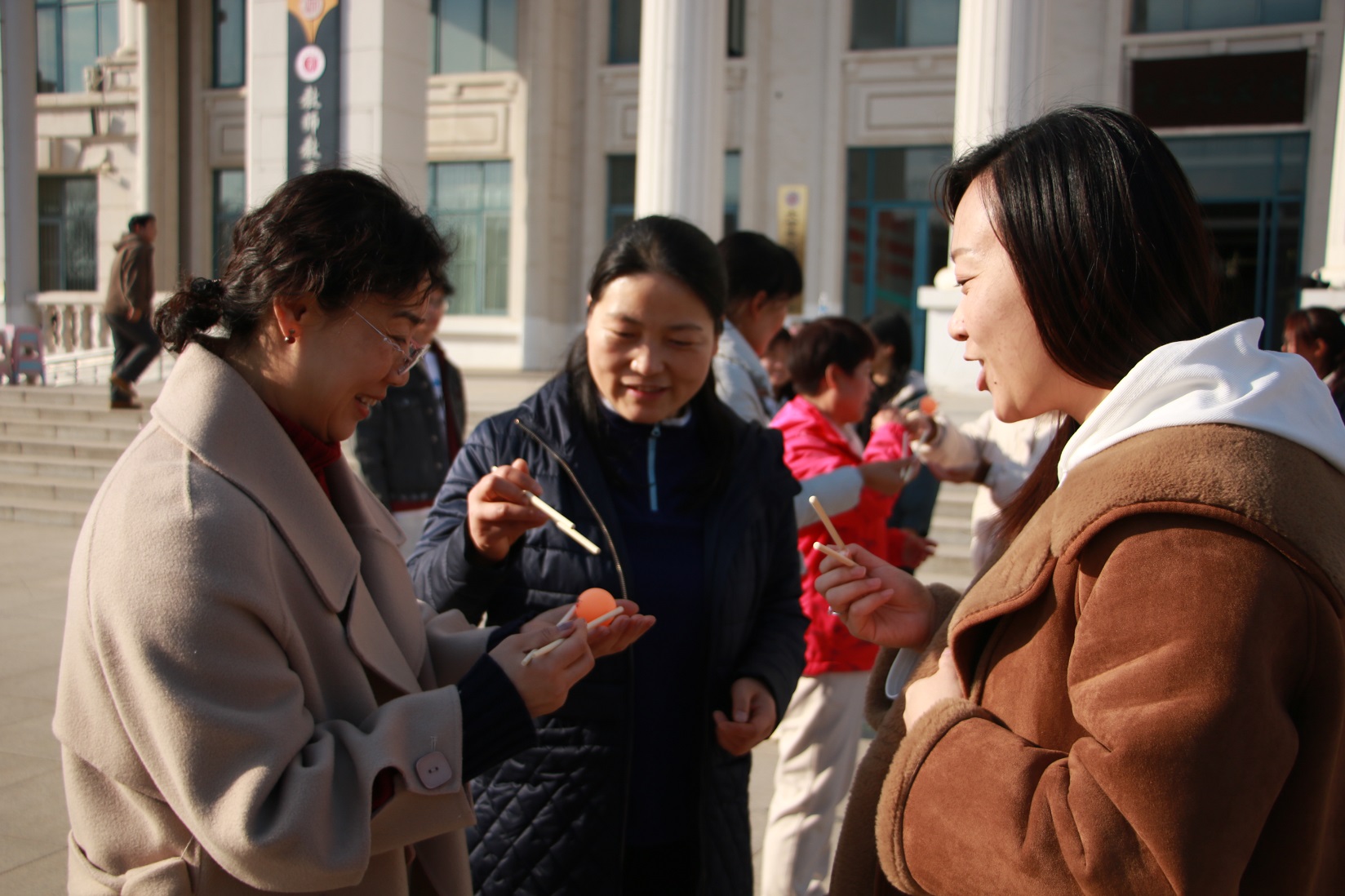 在第三环节的夹乒乓球活动中,各组教师成员全神贯注,用筷子将乒乓球稳稳地放进筐中,完成了默契的团队配合。此次活动中处处见笑容,时时闻笑声,大家尽情享受活动带来的欢乐。