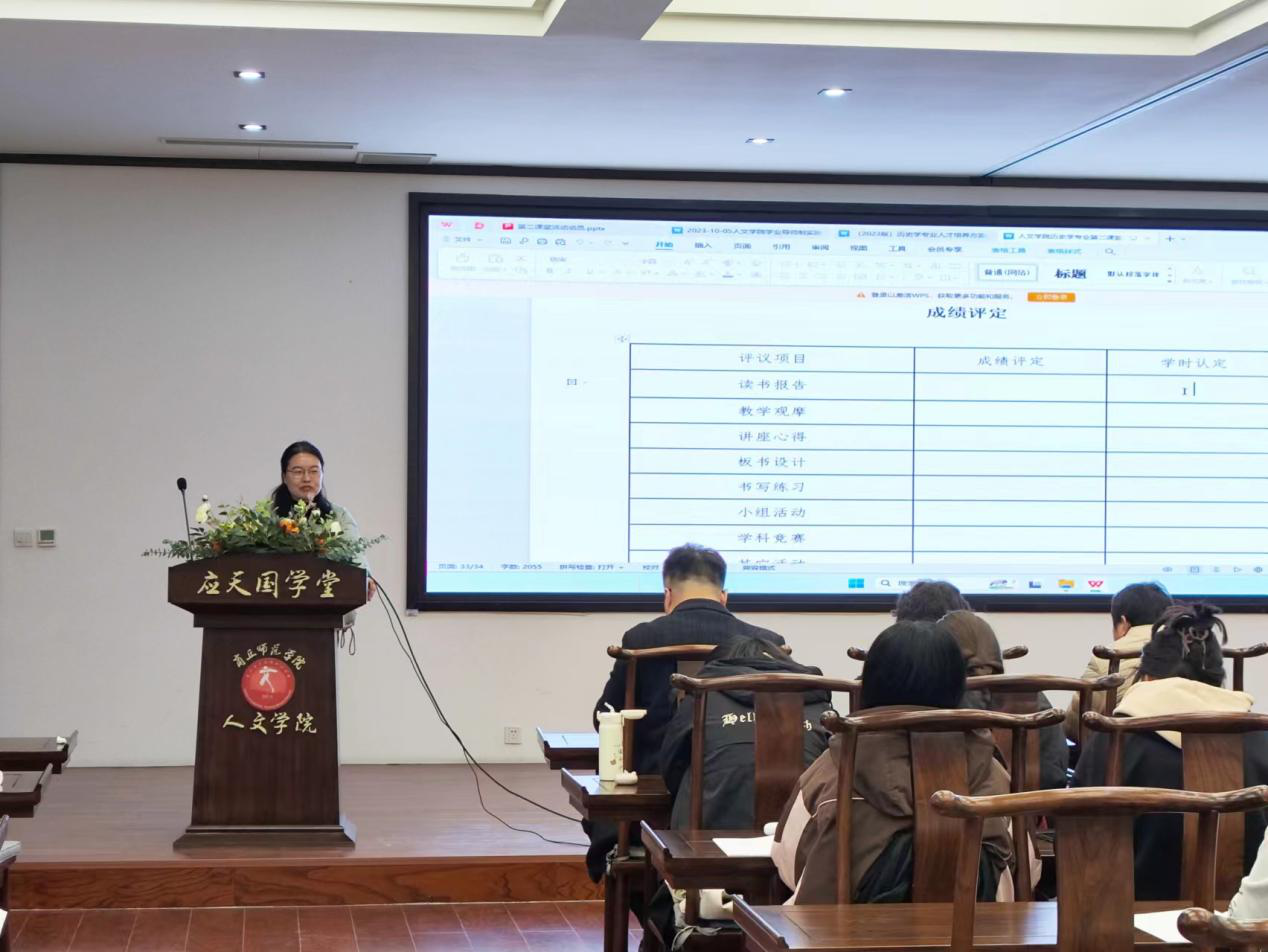 接下来,薛立芳介绍了第二课堂活动的基本内容,成绩评定与学时认定的具体细则。她要求学业导师认真执行第二课堂学时认定办法,督促指导学生完成各项学习任务。鼓励学生扎实积累,切实提升学科素养与教学能力,在不断的练习与实践中培育高尚师德,为未来成为优秀的中学历史教师做好准备。