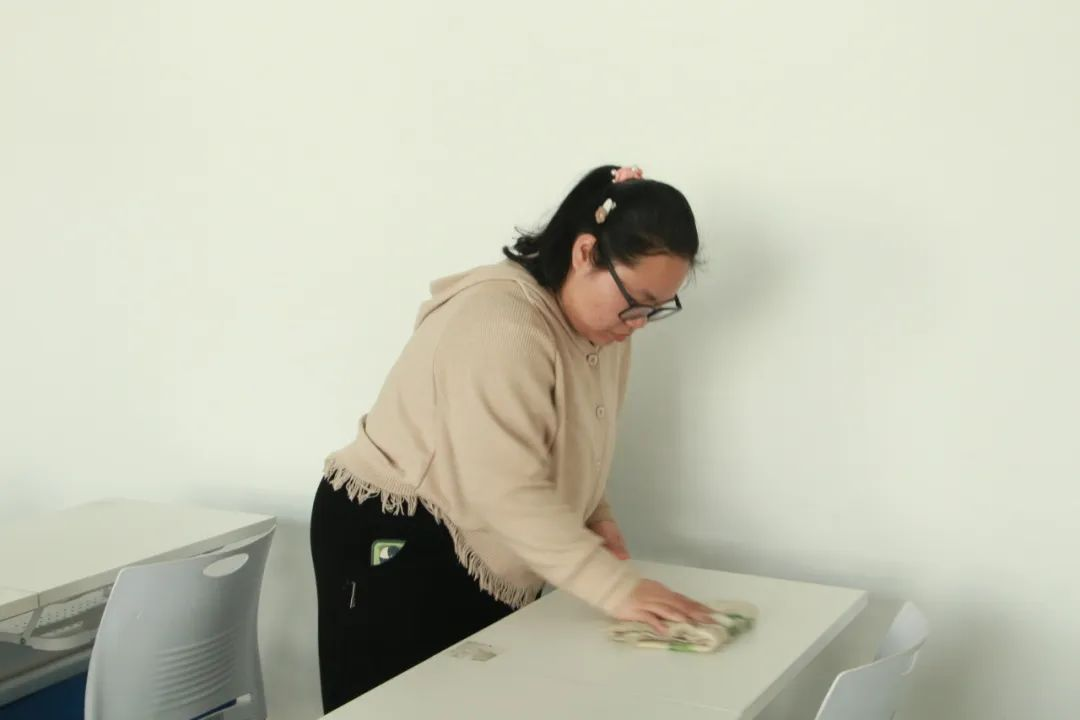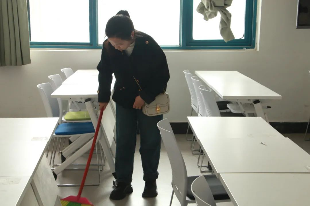 活动中,同学们认真打扫,扫地、摆放桌椅、收拾讲桌、擦黑板和桌椅……分工明确,干劲十足。打扫结束,每个教室变得焕然一新,窗明几净。