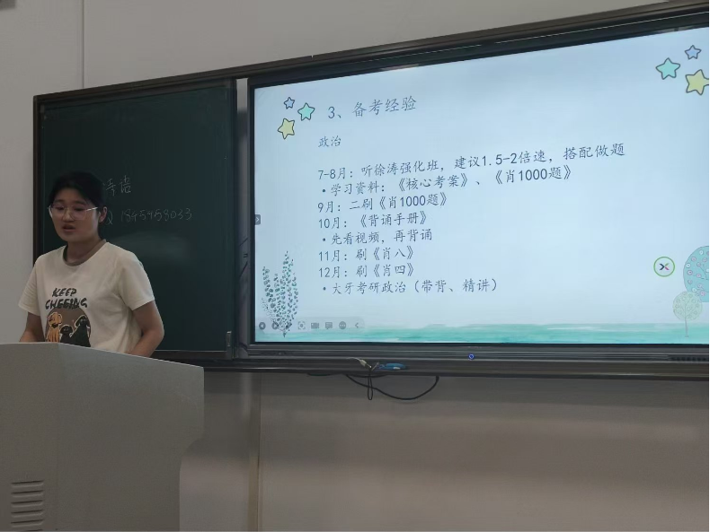 随后,7位成功上岸的同学依次上台,从考研动机与院校选择、复习方法、时间管理与心态调整、复试及调剂经验等方面,分享考研的宝贵经验。这些分享既有成功的经验,也有教训的总结,让在场同学深受启发。