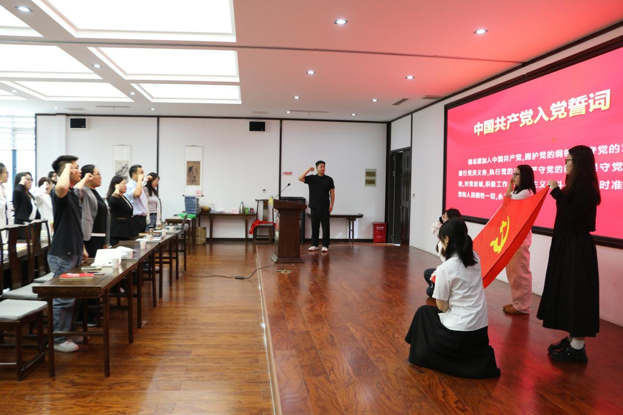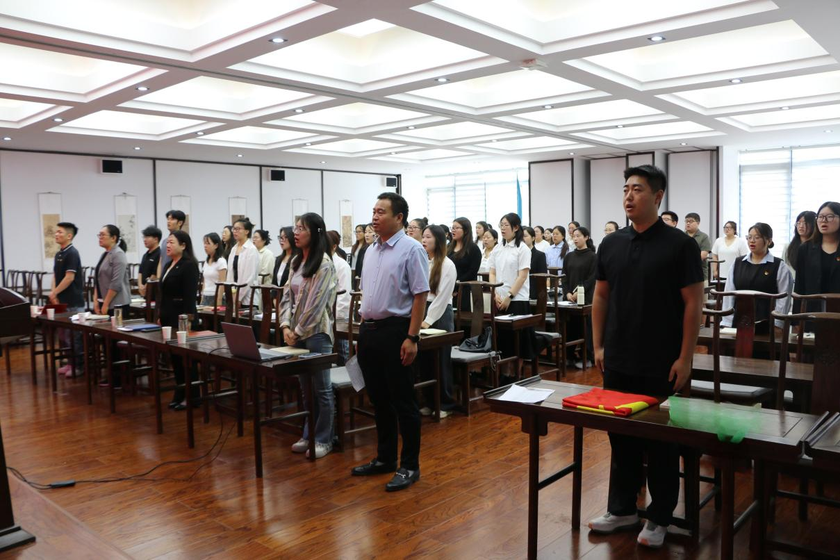 会议在庄严的国歌声中拉开帷幕。全体参会人员起立,齐声高唱国歌,激昂的旋律回荡在会场,点燃了每位党员心中的爱国热情与责任担当。随后,全体毕业生党员面向党旗,庄严地举起右拳,重温入党誓词,铿锵有力的誓言进一步坚定了党员的理想信念。
