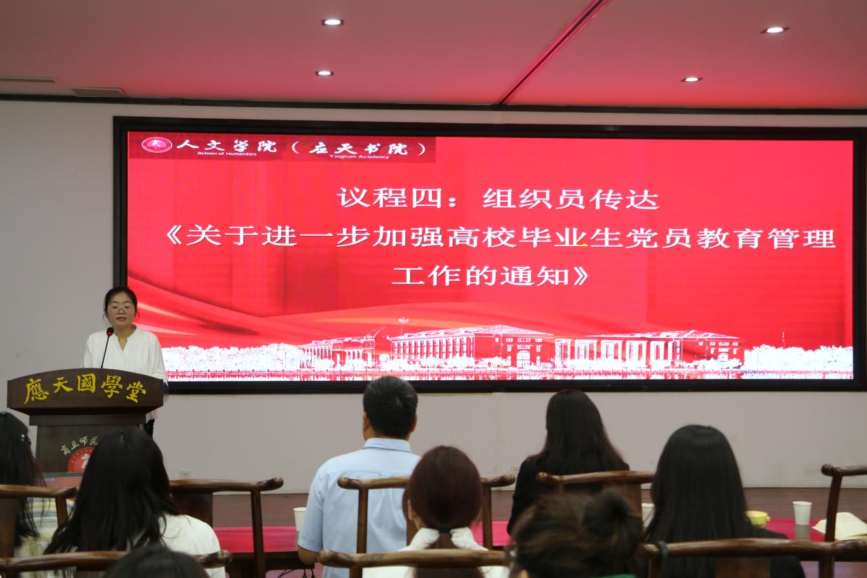最后,组织员传达了《毕业生离校教育通知》,详细讲解了离校前的各项工作安排与注意事项,强调毕业生党员要发挥模范带头作用,积极配合学院完成离校工作,同时要持续保持党员的先进性和纯洁性,在未来的学习、工作和生活中展现党员风采。