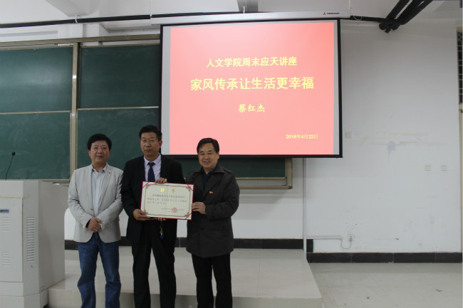 2018年4月22日晚七点,诸侯快讯入口官网邀请商丘市委组织部蔡红杰老师在平原路校区实验组团楼125教室举办 “家风传承让生活更幸福”应天周末讲坛。李可亭院长、朱凤祥副院长出席此次讲座。2017级汉语言文学专业全体学生现场聆听。讲座由朱凤祥副院长主持。