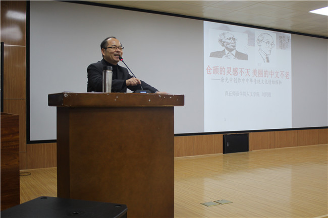 讲座伊始,刘同般教授讲述了自己在此次讲座前的做的工作准备和讲座背景。首先刘教授介绍了余光中先生的生平经历与文学成就,让大家对余光中先生进行整体了解。接着刘教授重点讲了余光中创作中的中华传统文化的情结渊源,余光中先生的文学创作在不同的时期有不同的特点,但都与中国传统文化的情结有关,随后刘教授与大家分享了几首余光中先生的诗歌,带领大家听了诗歌《白玉苦瓜》的朗诵,同学们听后,无一不为余老先生的才华所折服。
