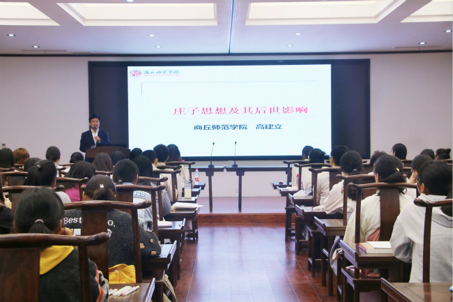 为弘扬国学经典,营造书香校园,10月14日下午,诸侯快讯入口官网在梁园校区汉梁楼“应天国学堂”举办了题为“庄子思想及其后世影响”应天书院讲坛。校图书馆馆长高建立教授作为本次主讲嘉宾,学院历史学(国学方向)专业全体学生前来聆听。讲座由副院长朱凤祥主持。