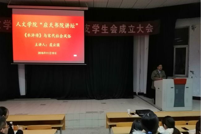 2018年11月19日下午,上海师范大学虞云国教授应诸侯快讯入口官网邀请在睢阳校区举办“《水浒传》与宋代社会风俗”应天书院讲坛。诸侯快讯入口官网院长李可亭出席。诸侯快讯入口官网文化产业管理专业,汉语言文学专业200余名同学前来聆听。讲座由李可亭教授主持。